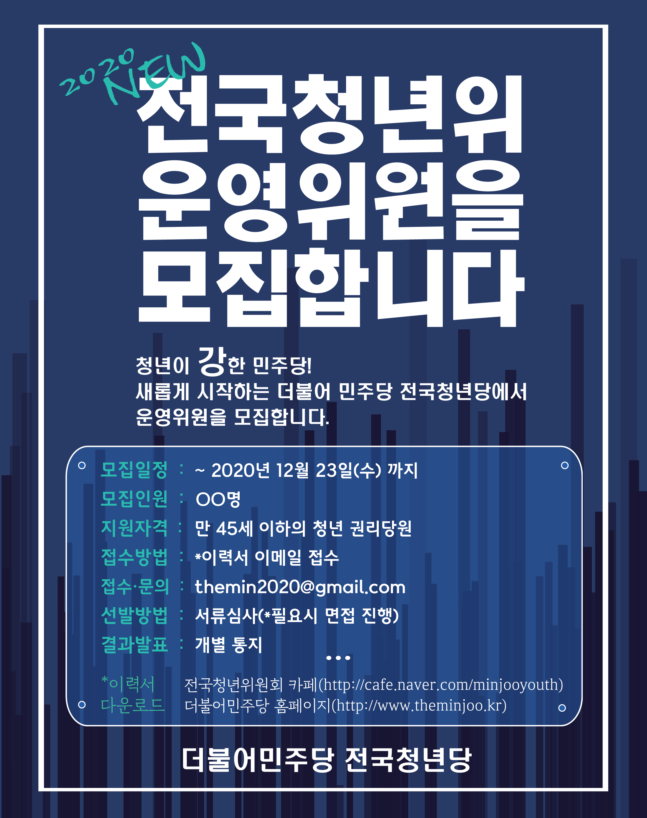 더불어민주당 홈페이지( http://www.theminjoo.kr ), 전국청년위원회 카페( http://cafe.naver.com/minjooyouth ) 통해 이력서 다운로드 후 이메일( themin2020@gmail.com ) 이력서 및 문의 접수