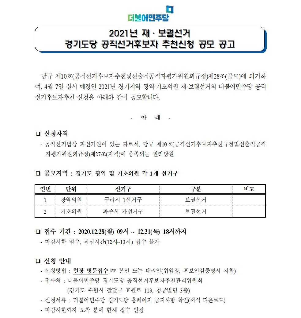 2021년 재보궐선거 경기도당 공직선거후보자 추천신청 공모 공고