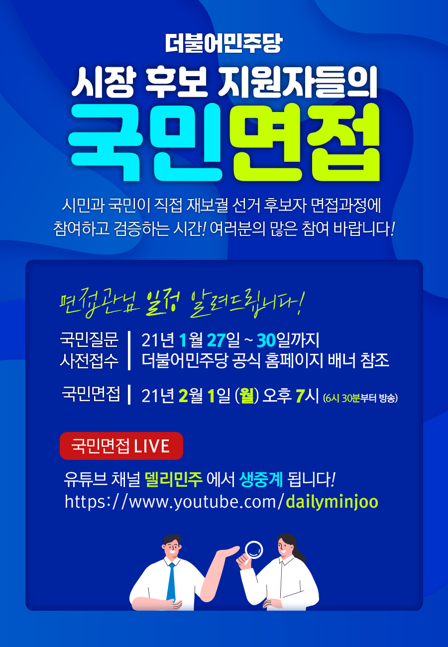 그동안 소수의 심사위원만 참여하여 비공개로 진행되었던 방식을 과감히 탈피한 이번 면접은 다가오는 2월 1일 민주당 유튜브 채널 ‘델리민주’를 통해 중계될 예정입니다.