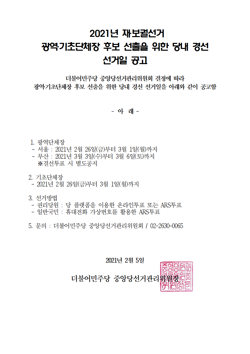 2021년 재‧보궐선거 광역‧기초단체장 후보 선출을 위한 당내 경선 선거일 공고