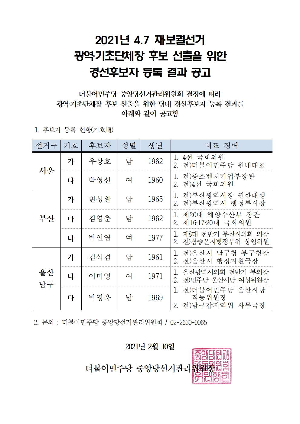 2021년 4.7 재‧보궐선거 광역‧기초단체장 후보 선출을 위한 경선후보자 등록 결과 공고