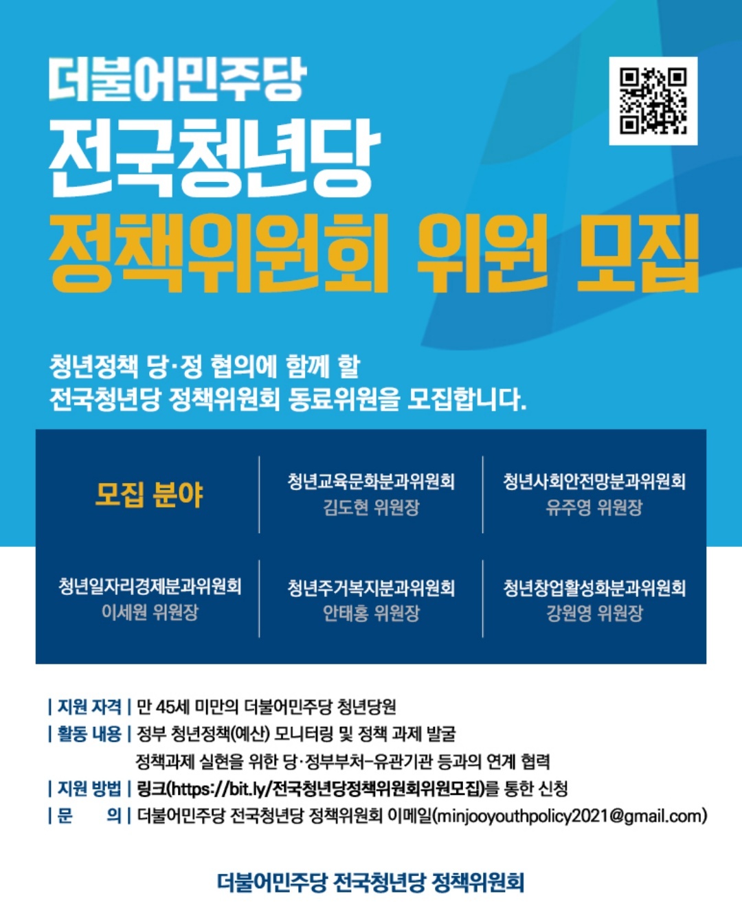 - 지원 방법 : 링크(https://bit.ly/전국청년당정책위원회위원모집) 를 통한 신청