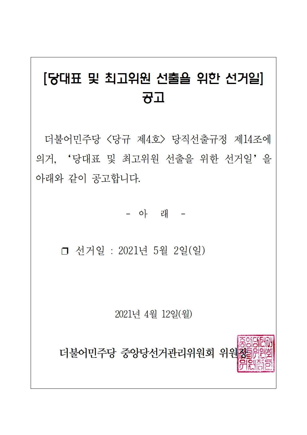 당대표 및 최고위원 선출을 위한 선거일 공고
