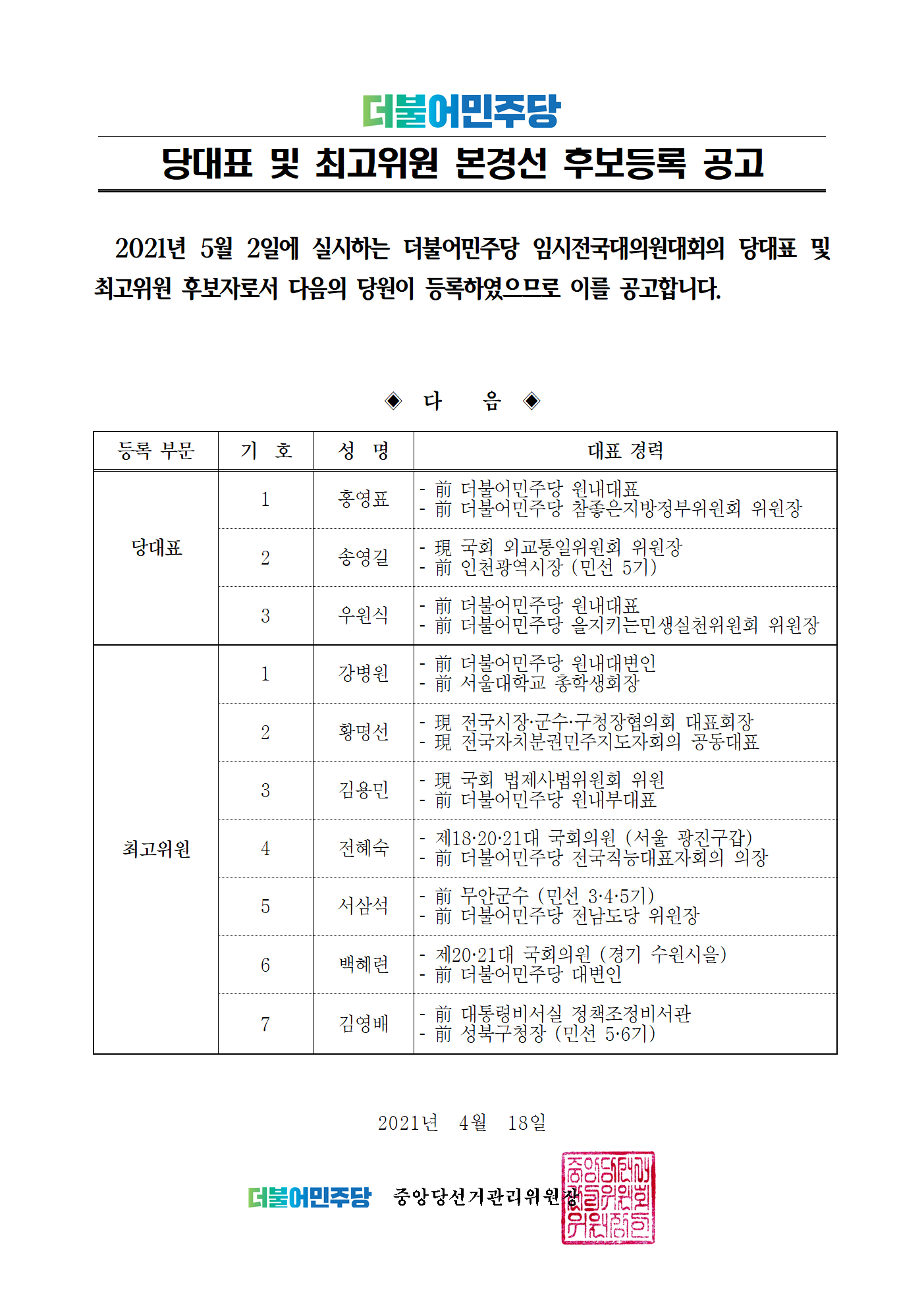 임시전국대의원대회 선거인명부 열람 및 이의신청 공고