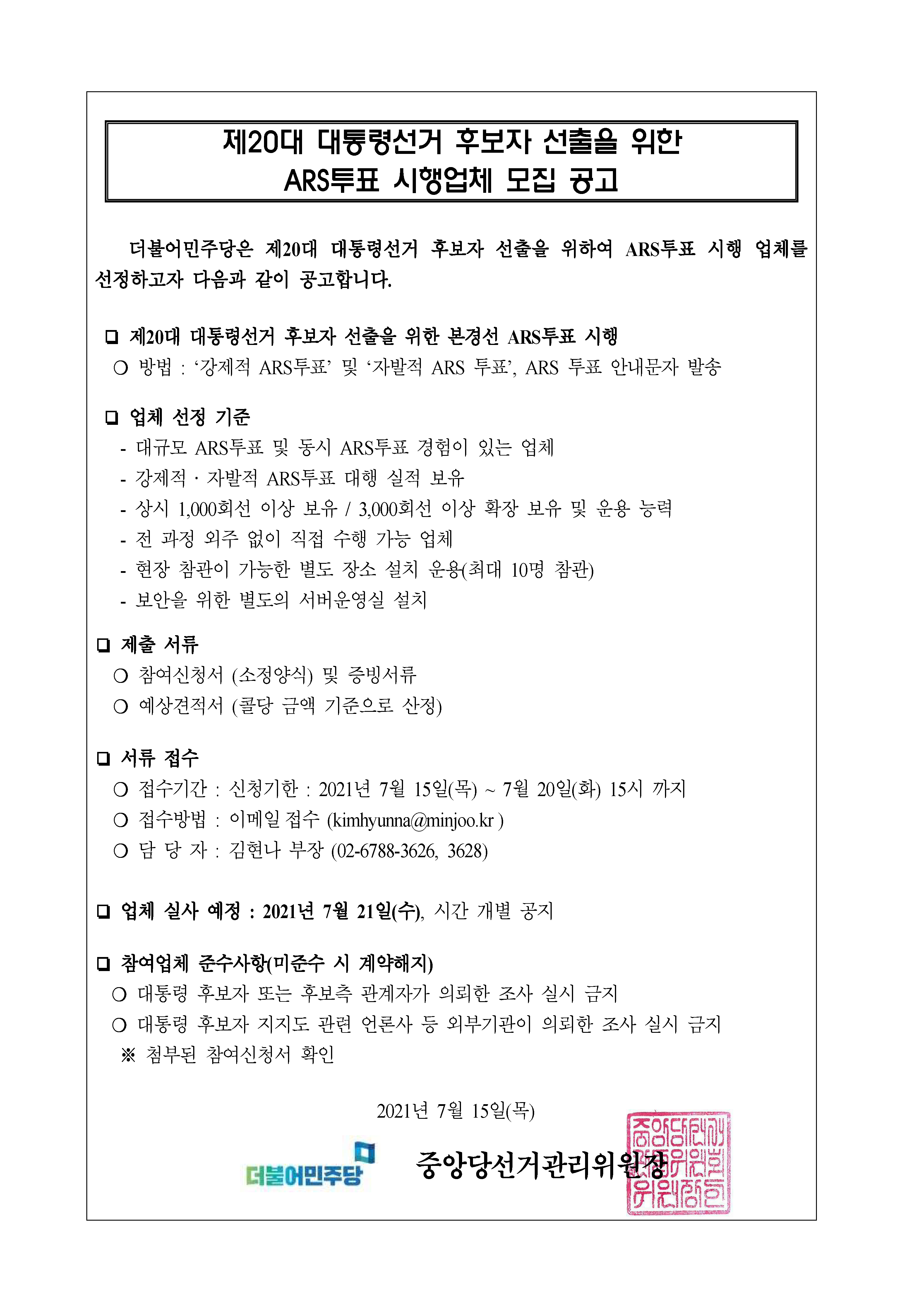더불어민주당 제20대 대통령선거 후보자 선출을 위한 순회경선 대행업체 모집 공고