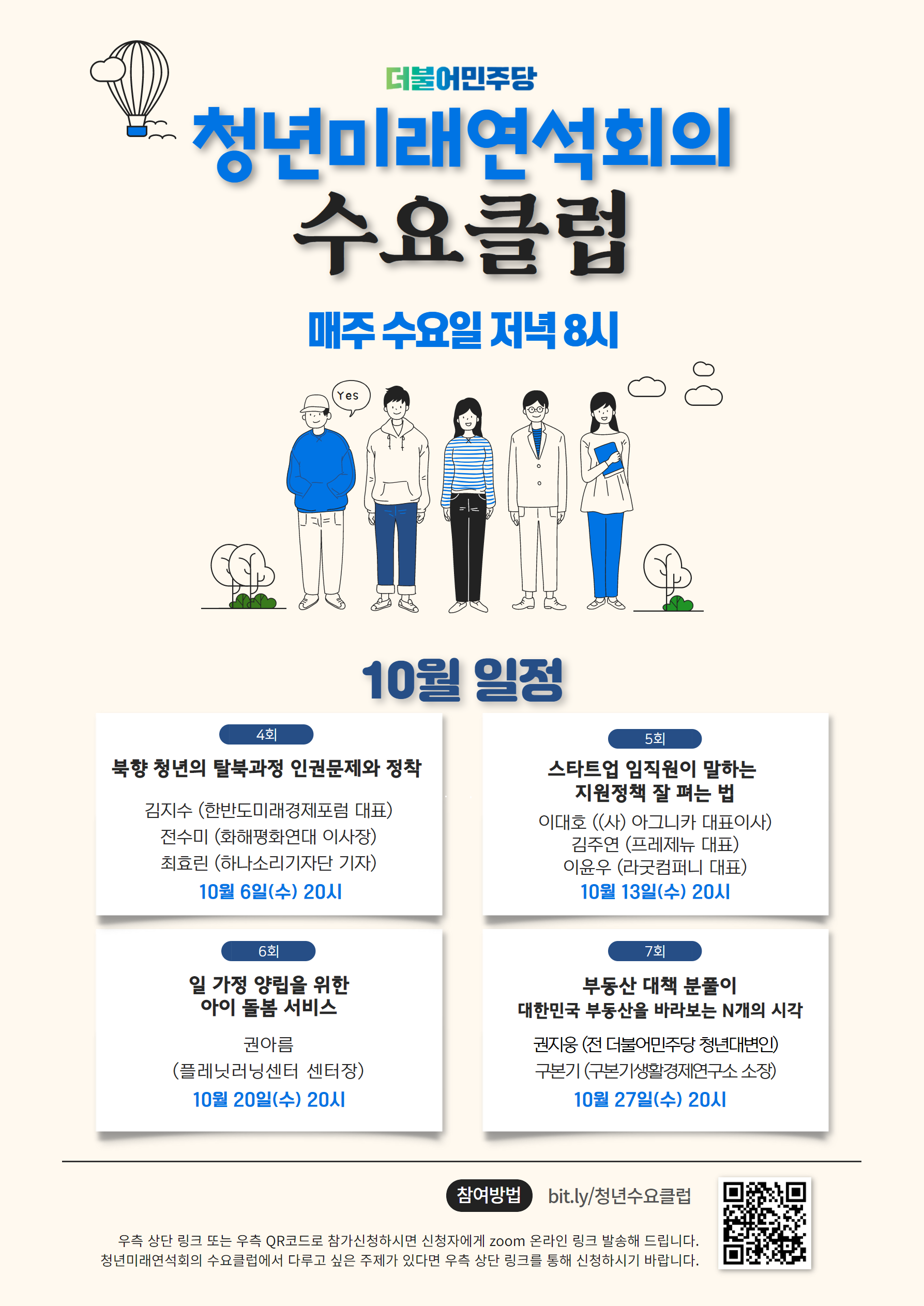 10월 수요클럽의 주제는 북향(탈북)청년’, ‘창업’, ‘·가정 양립', '부동산 정책'입니다.