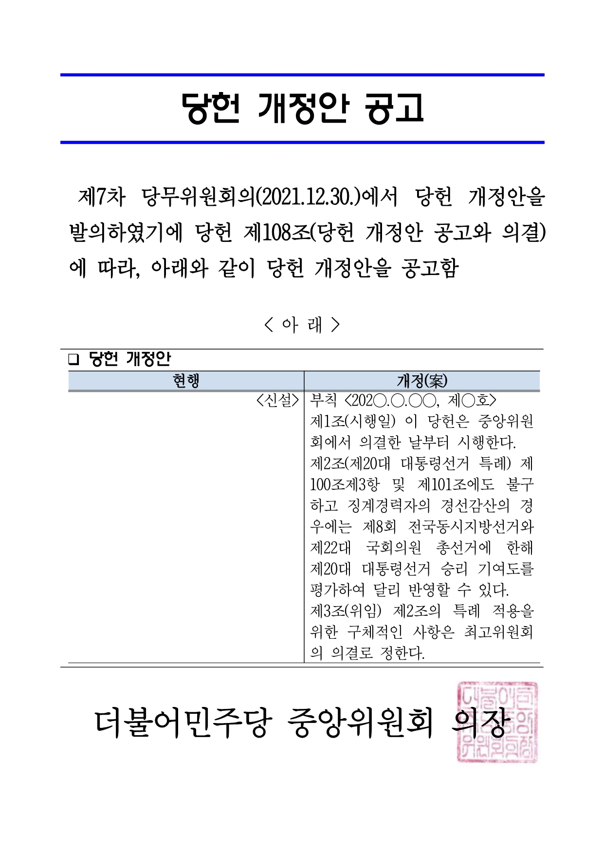 당헌 개정안 공고문(제7차 당무위원회의_21.12.30.)