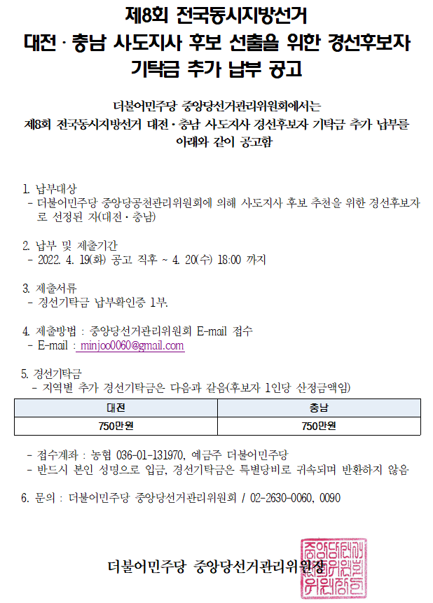 제8회 전국동시지방선거 대전·충남 시․도지사 후보 선출을 위한 경선후보자 기탁금 추가 납부 공고