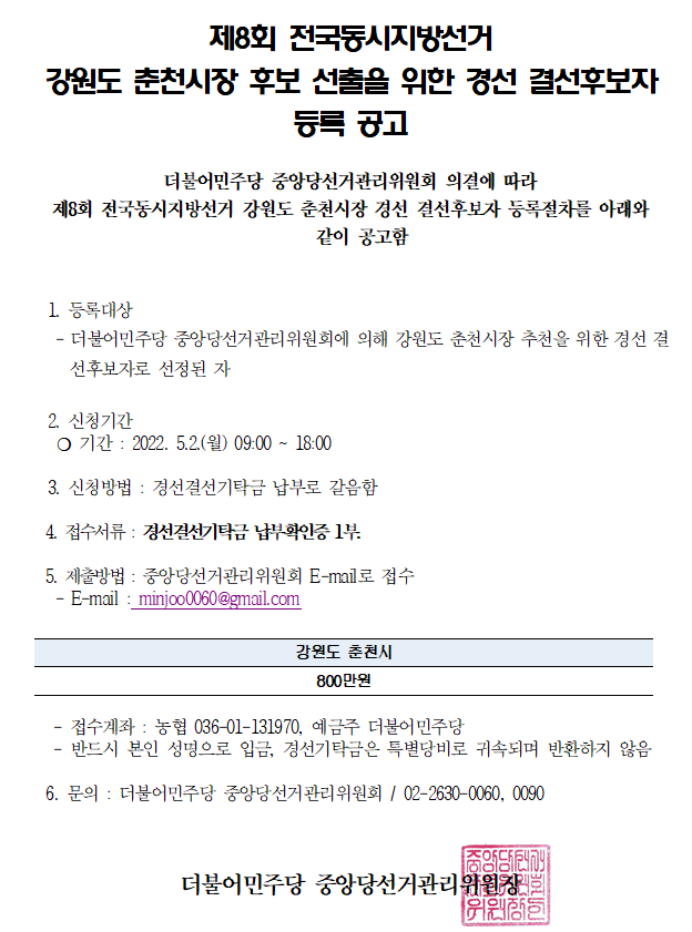 제8회 전국동시지방선거 강원도 춘천시장 후보 선출을 위한 경선 결선후보자 등록 공고