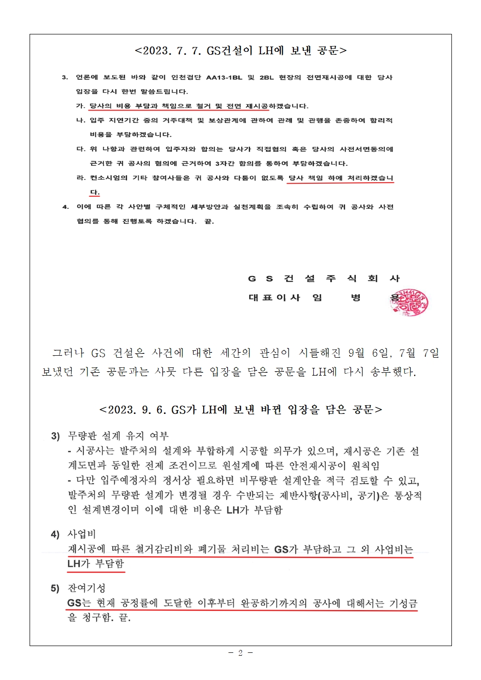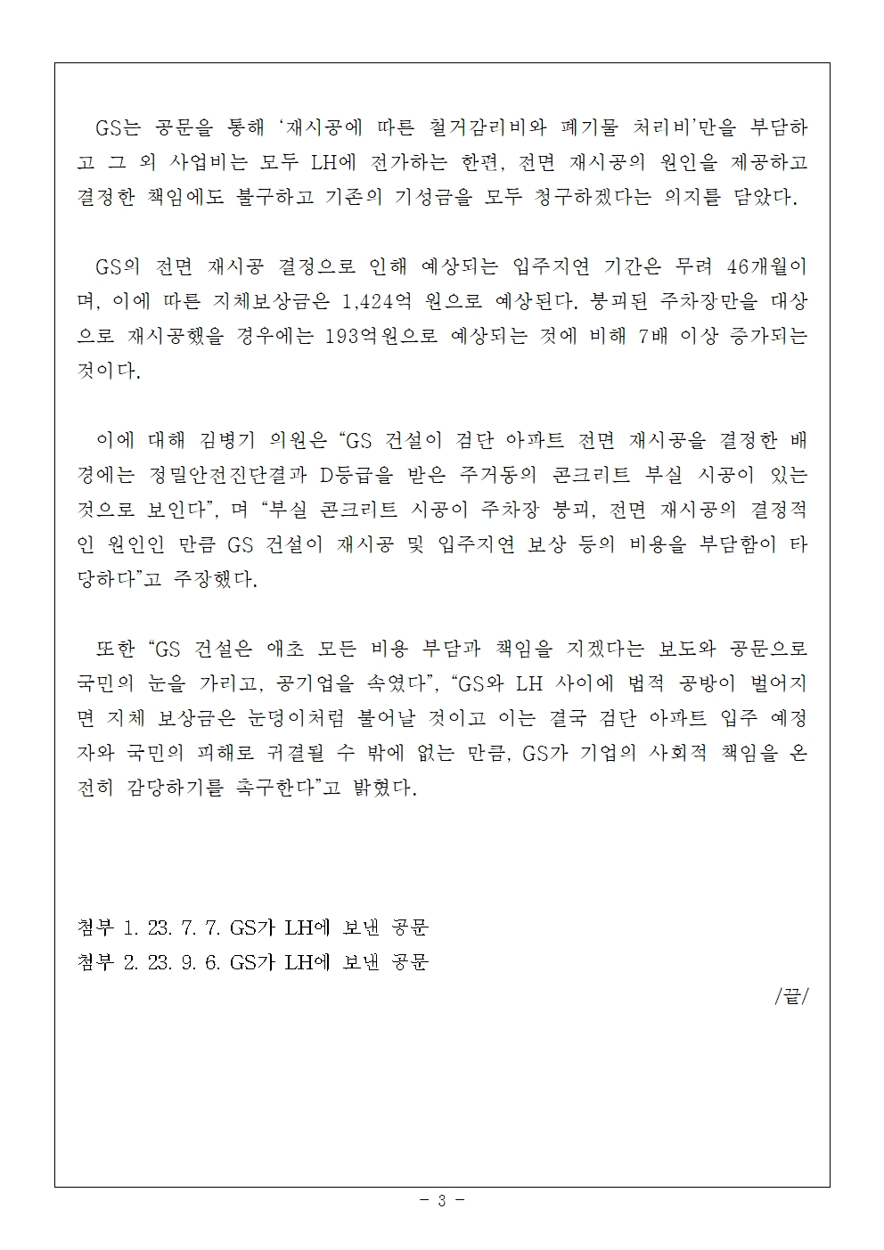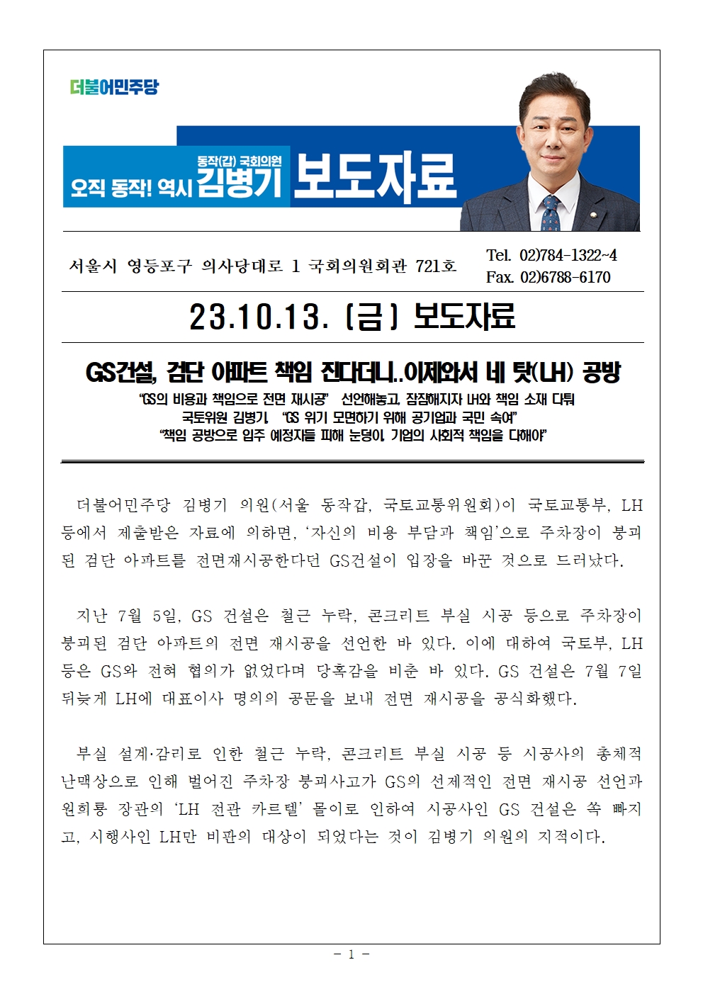 [국회의원 김병기 보도자료] GS건설, 검단 아파트 책임 진다더니... 이제와서 LH탓 공방