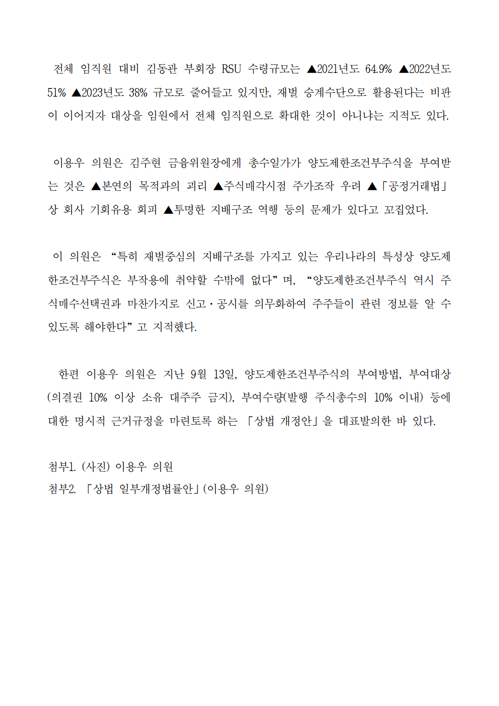 [보도자료] 이용우 의원_ 양도제한조건부주식 재벌 편법승계에 활용...신고·공시 제도 도입 필요!.hwp
