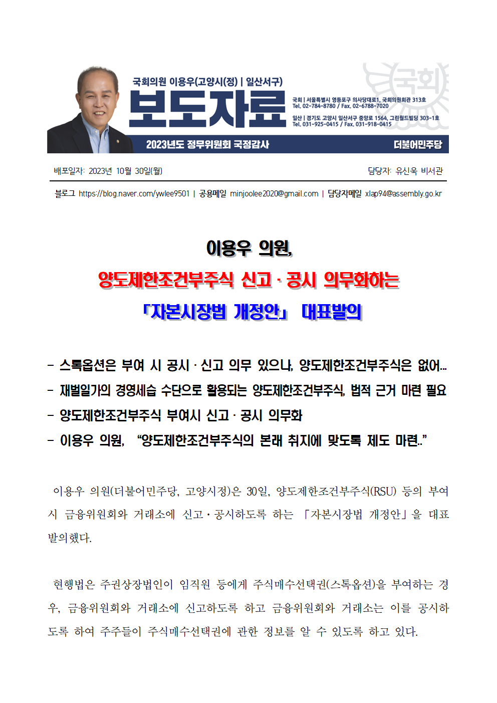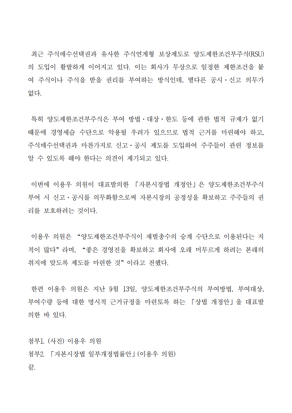 [보도자료] 이용우 의원_ 양도제한조건부주식 신고·공시 의무화하는 자본시장법 개정안 대표발의.hwp