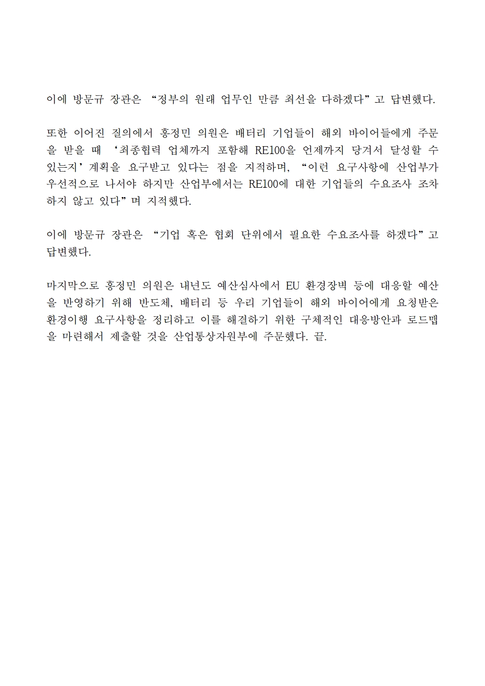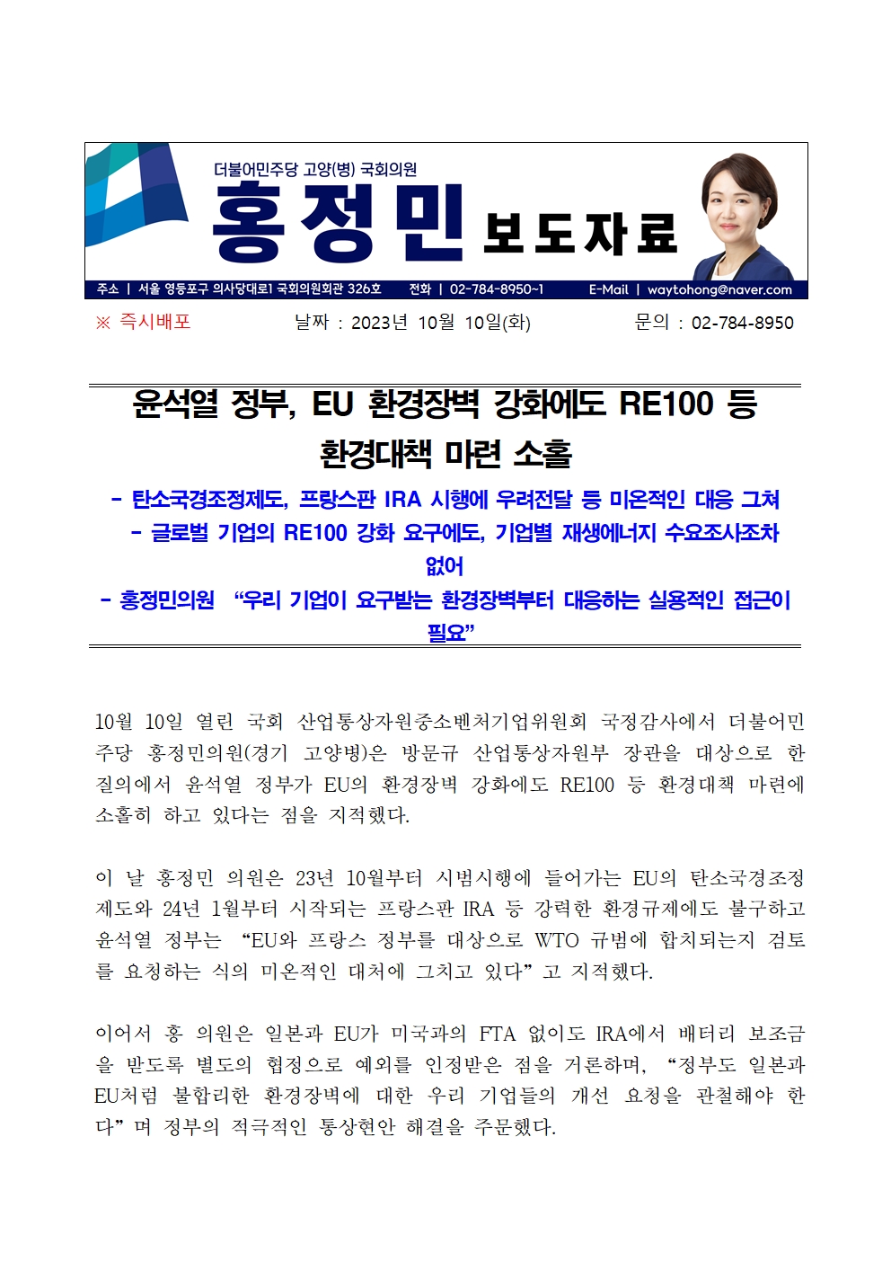 [홍정민 의원 보도자료] 윤석열 정부, EU 환경장벽 강화에도 RE100 등 환경대책 마련 소홀