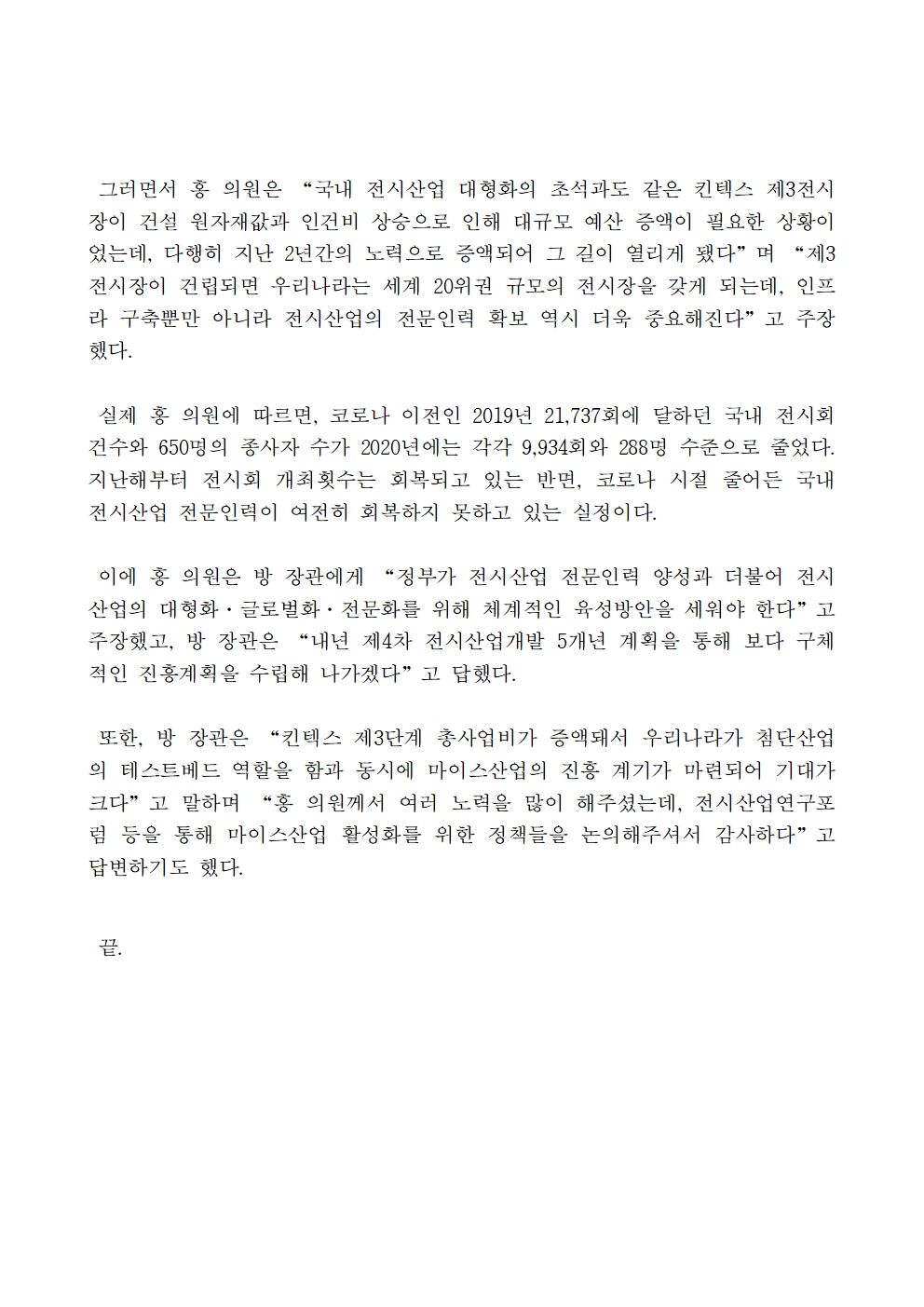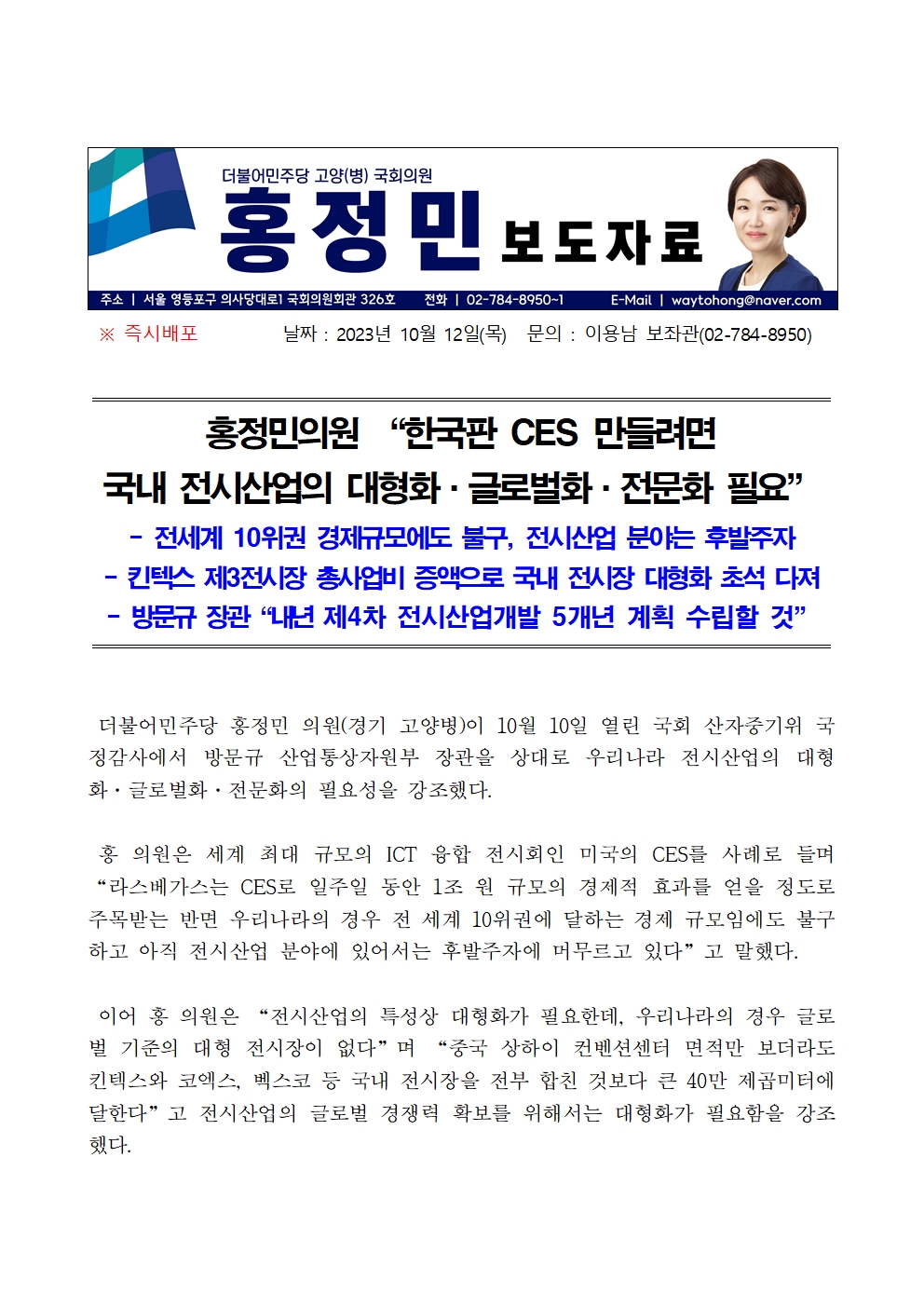 [홍정민 의원 보도자료] 한국판 CES 만들려면 국내 전시산업의 대형화·글로벌화·전문화 필요