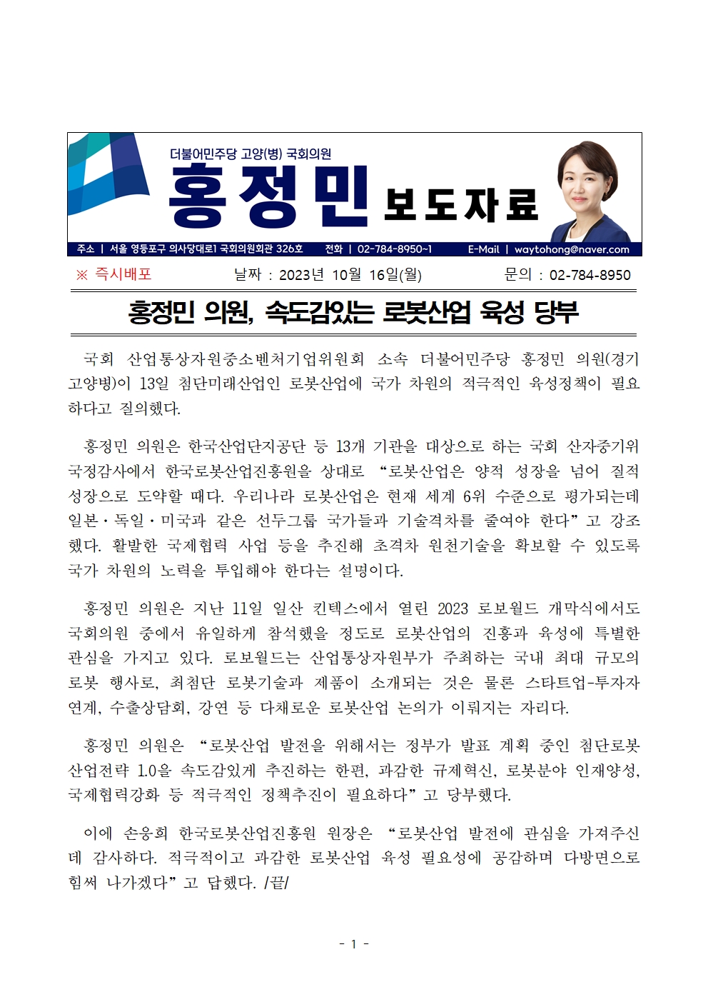 231016_보도자료_홍정민 의원 속도감있는 로봇산업 육성 당부.hwp