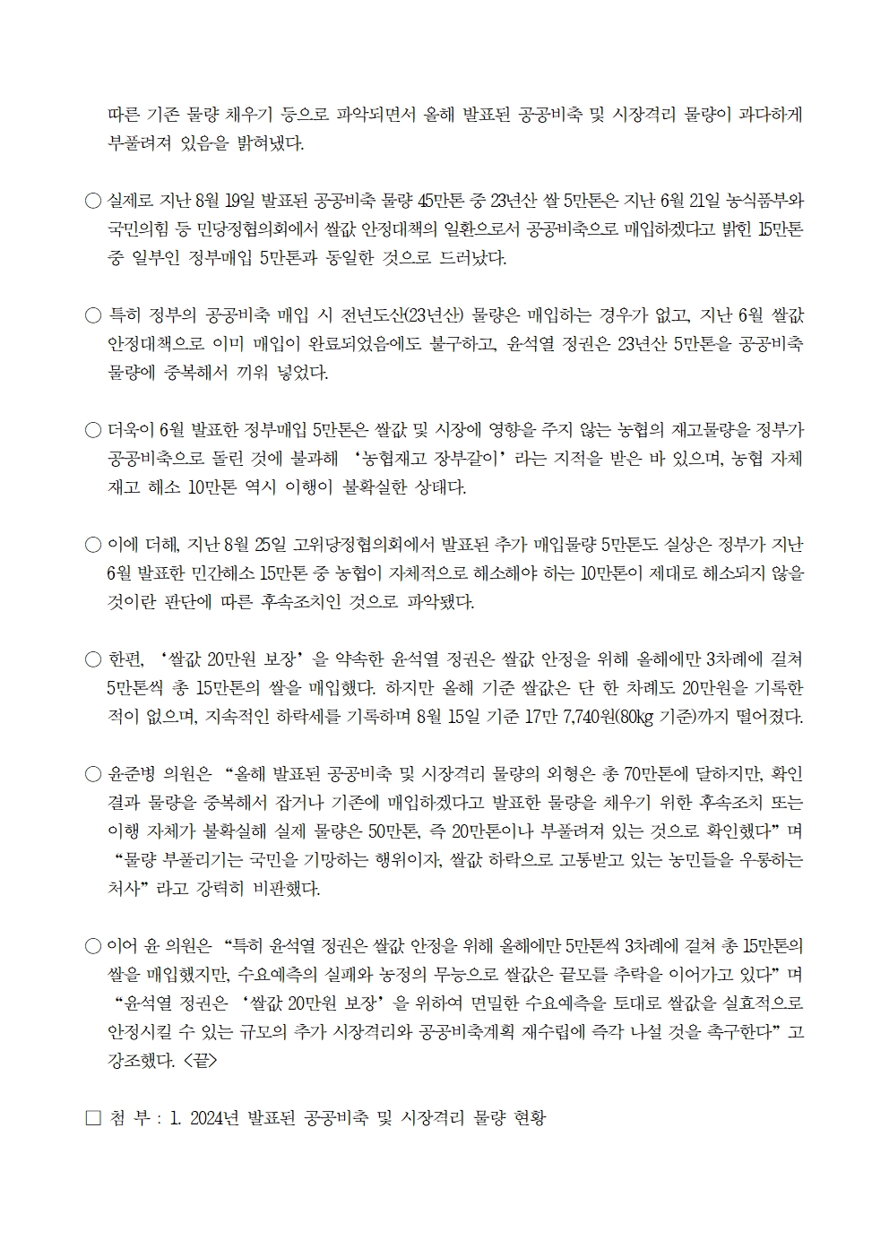 240902 [윤준병 의원 국정감사 보도자료] 윤석열 정권 올해 공공비축·시장격리 발표 물량 중 20만톤 부풀려!.hwp