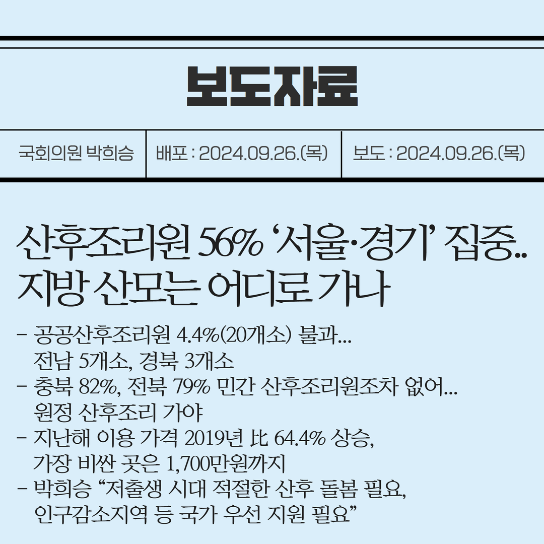 [국회의원 박희승 보도자료] 산후조리원 56% ‘서울·경기’ 집중.. 지방 산모는 어디로 가나