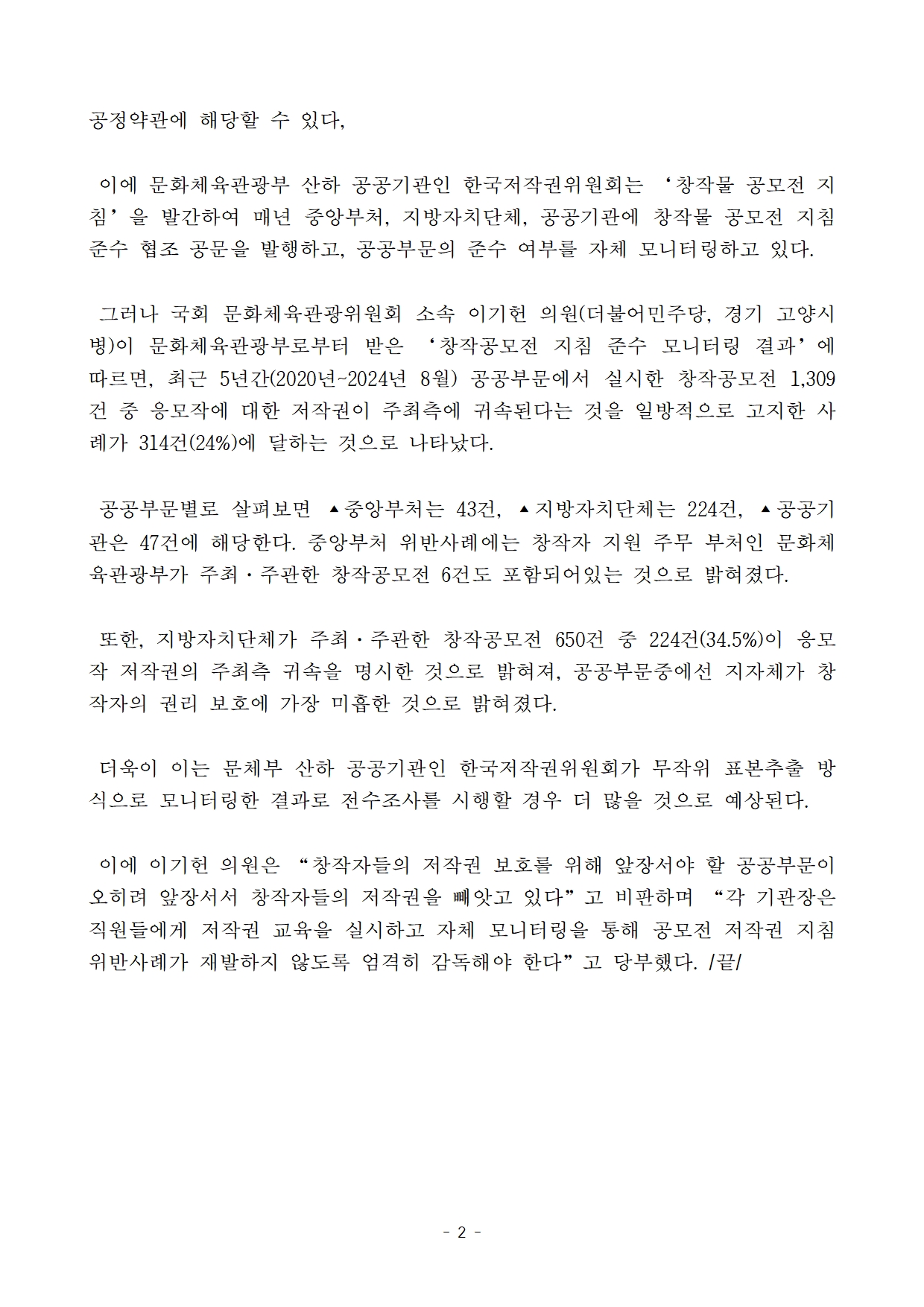 [이기헌 의원(고양시 병) 보도자료] 창작자 권리 무시? 공공부문 창작공모전, 4건 중 1건은 저작권 지침 위반