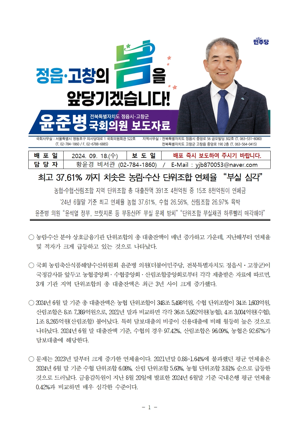 240918 [윤준병 의원 국정감사 보도자료] 37.61%까지 치솟은 농림‧수산 단위조합 연체율 “부실 심각” (1).hwp