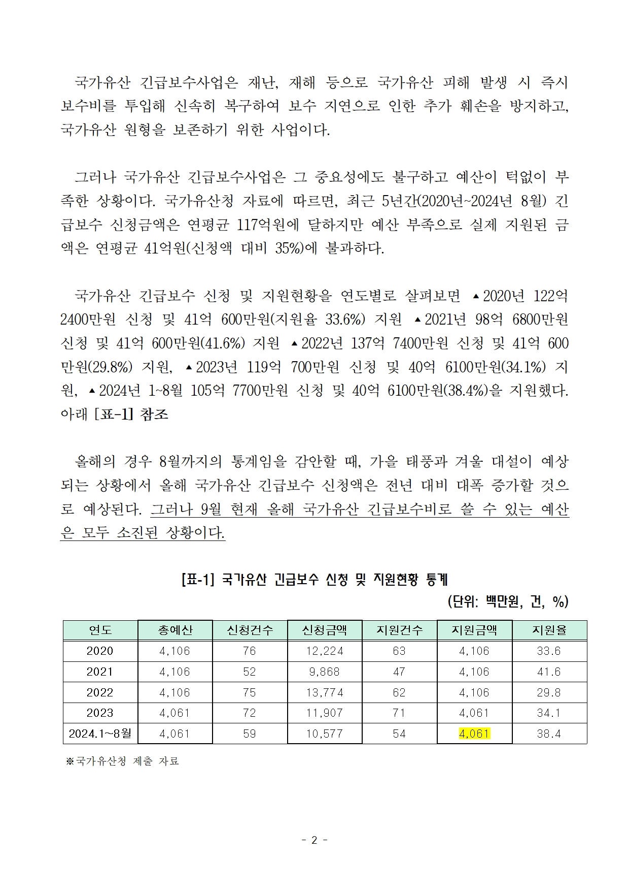 (최종)_이기헌의원실_국감보도자료_자연재해 대비 턱없이 부족한 국가유산 긴급보수비.hwp