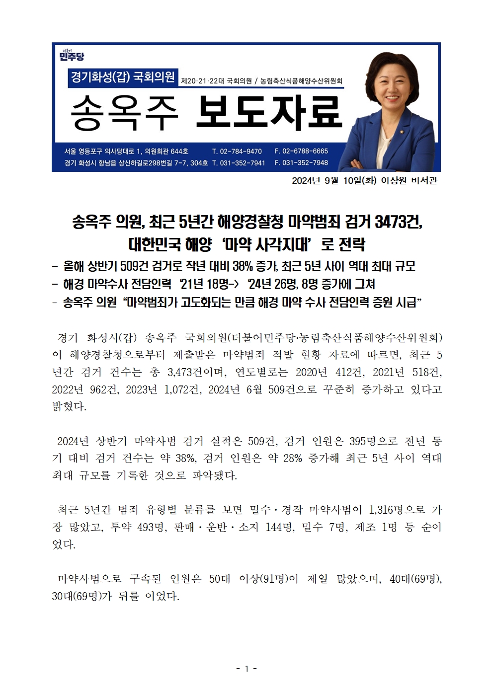 보도자료_송옥주의원실_해양경찰청 마약범죄 검거 3473건 대한민국 해양 마약 사각지대 전락.hwp