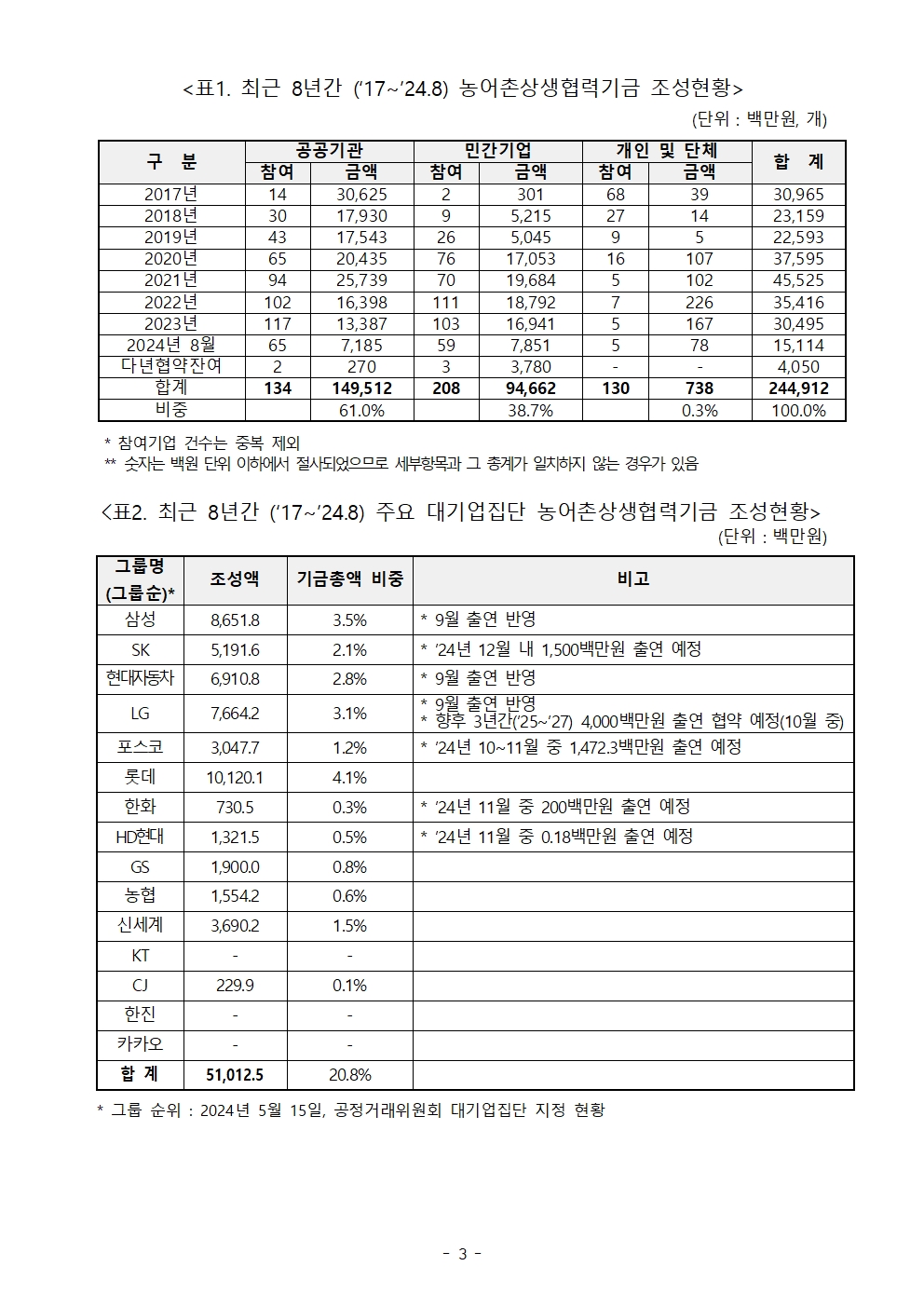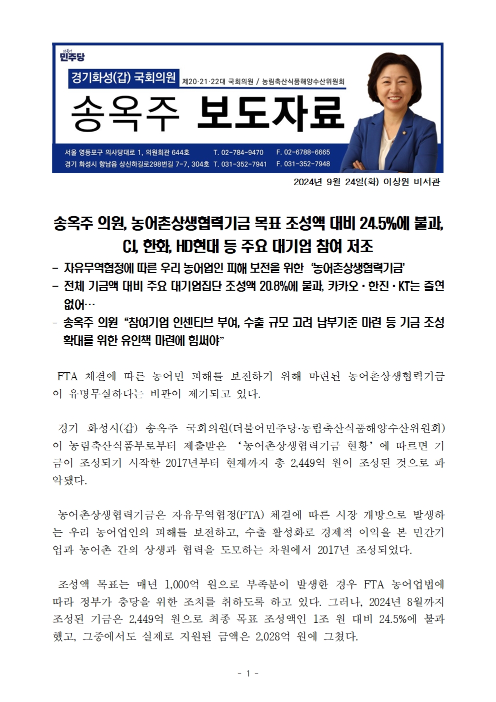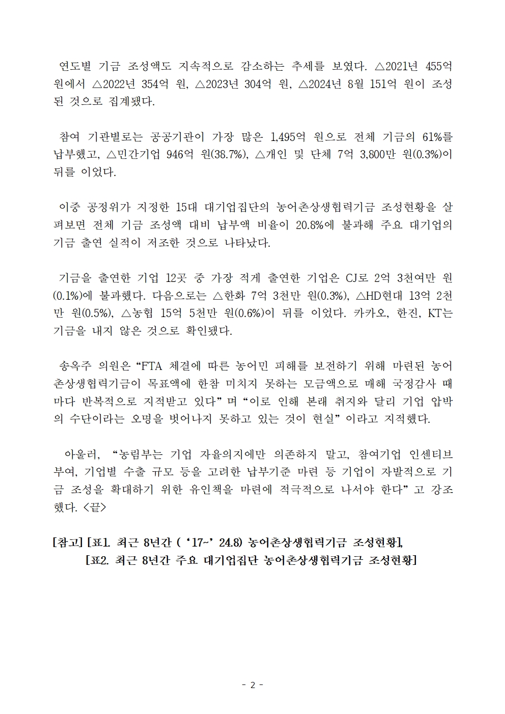 [국회의원 송옥주 국정감사 보도자료] 농어촌상생협력기금 조성 목표액 대비 24%에 불과, CJ, 한화, HD현대 등 주요 대기업 참여 저조