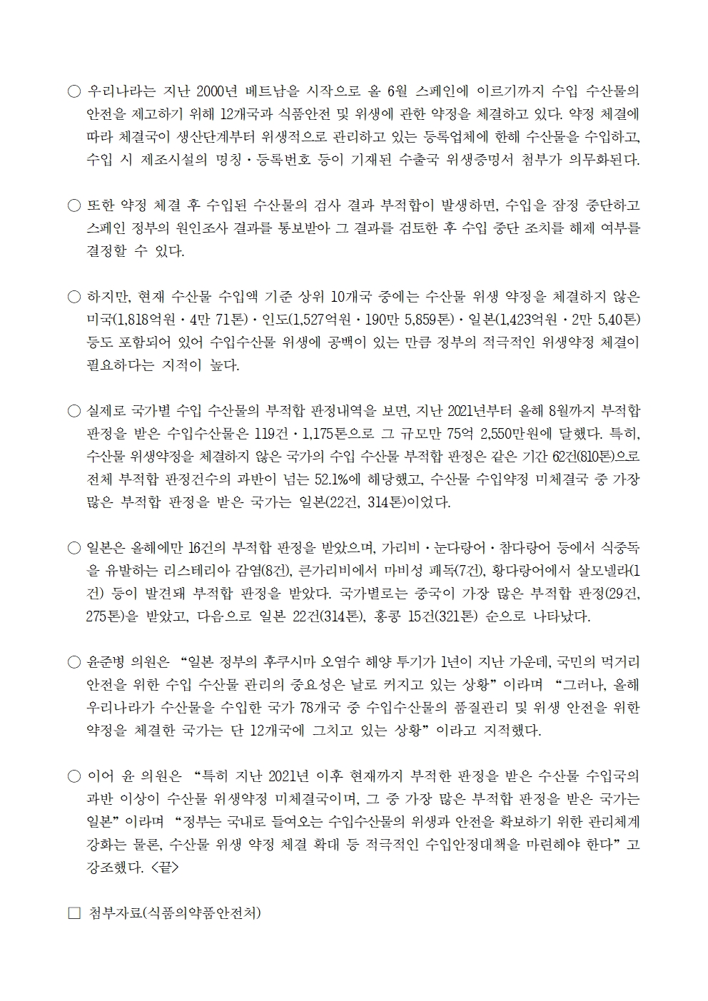241008 [윤준병 의원 국정감사 보도자료] 위생약정 미체결 국가 중 수산물 부적합 건수 가장 많은 국가는 일본.hwp