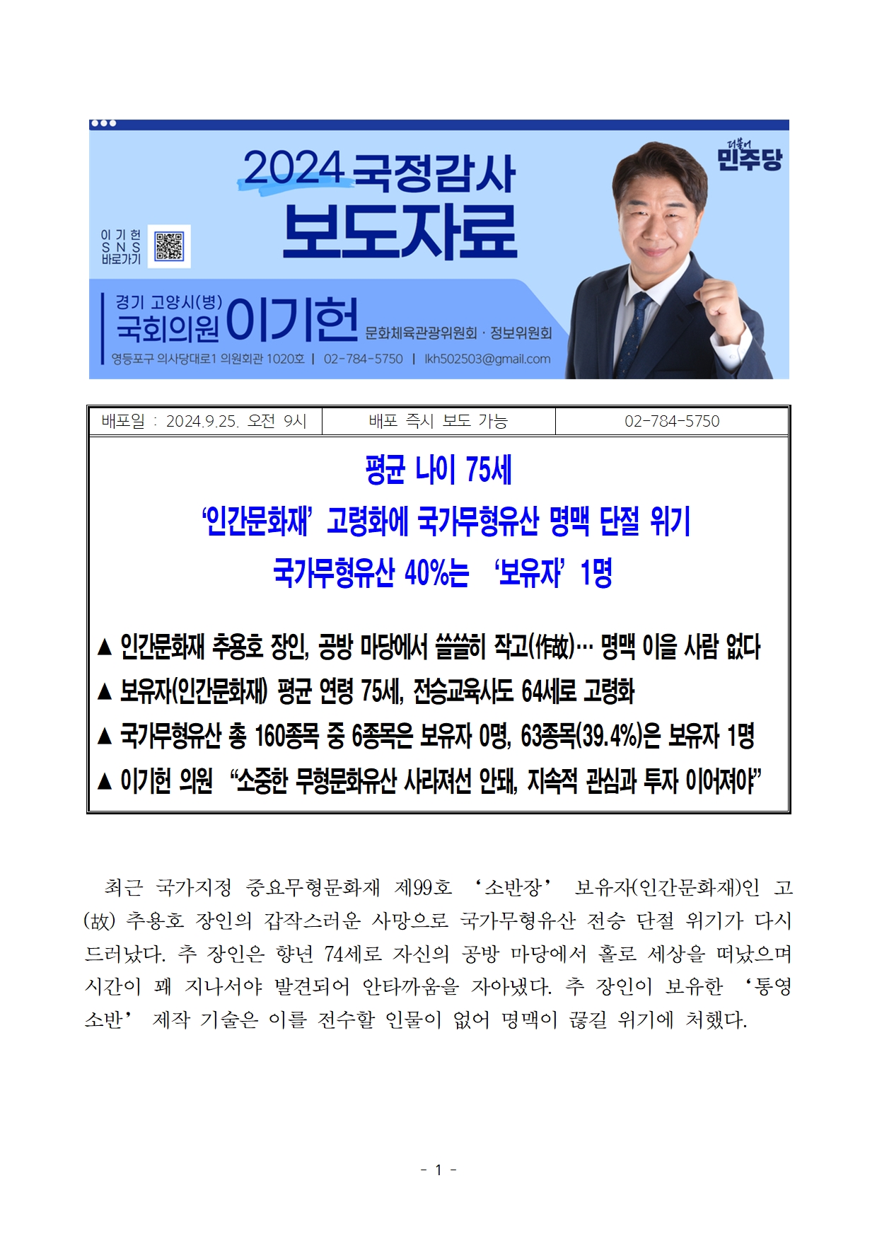 [이기헌 의원(고양시 병) 보도자료]평균 나이 75세 '인간문화재'고령화에 국가무형유산 명맥 단절 위기