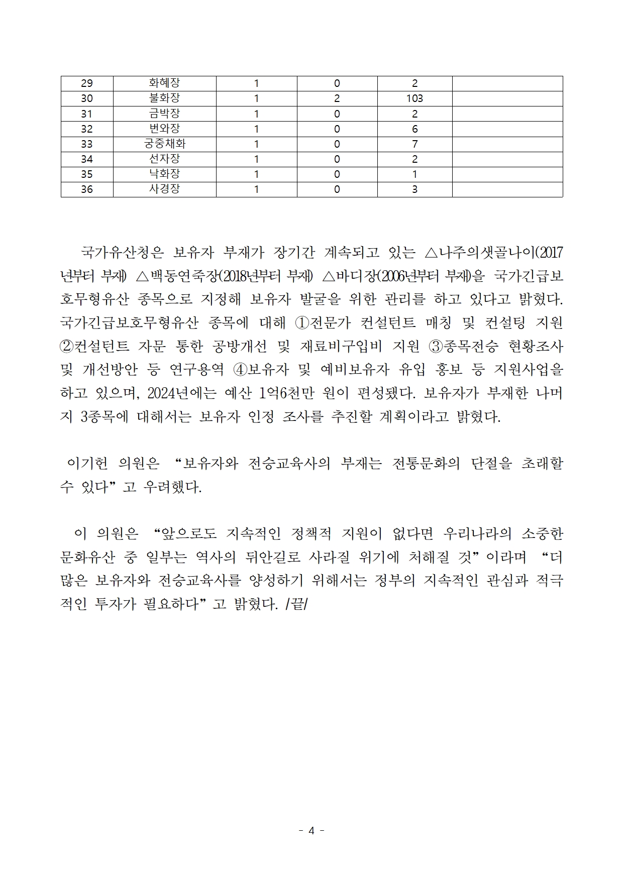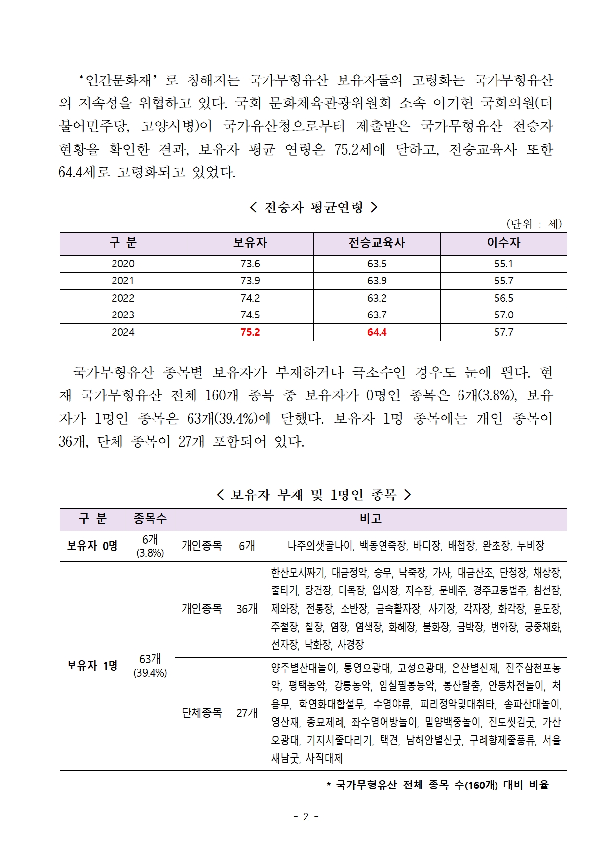 (최종)_이기헌의원실_국감보도자료_인간문화재 고령화에 국가무형유산 명맥 끊길 위기 높아져.hwp