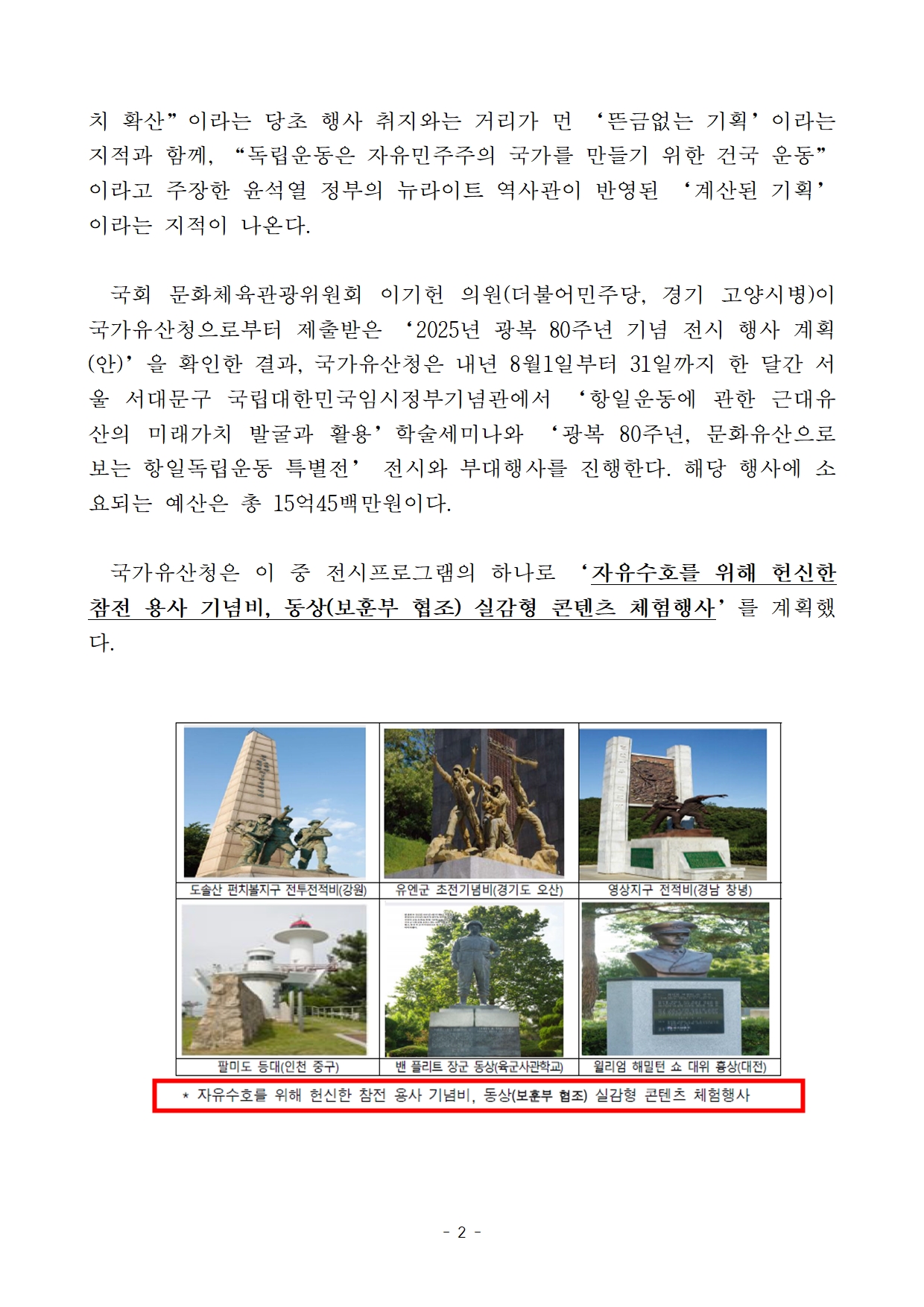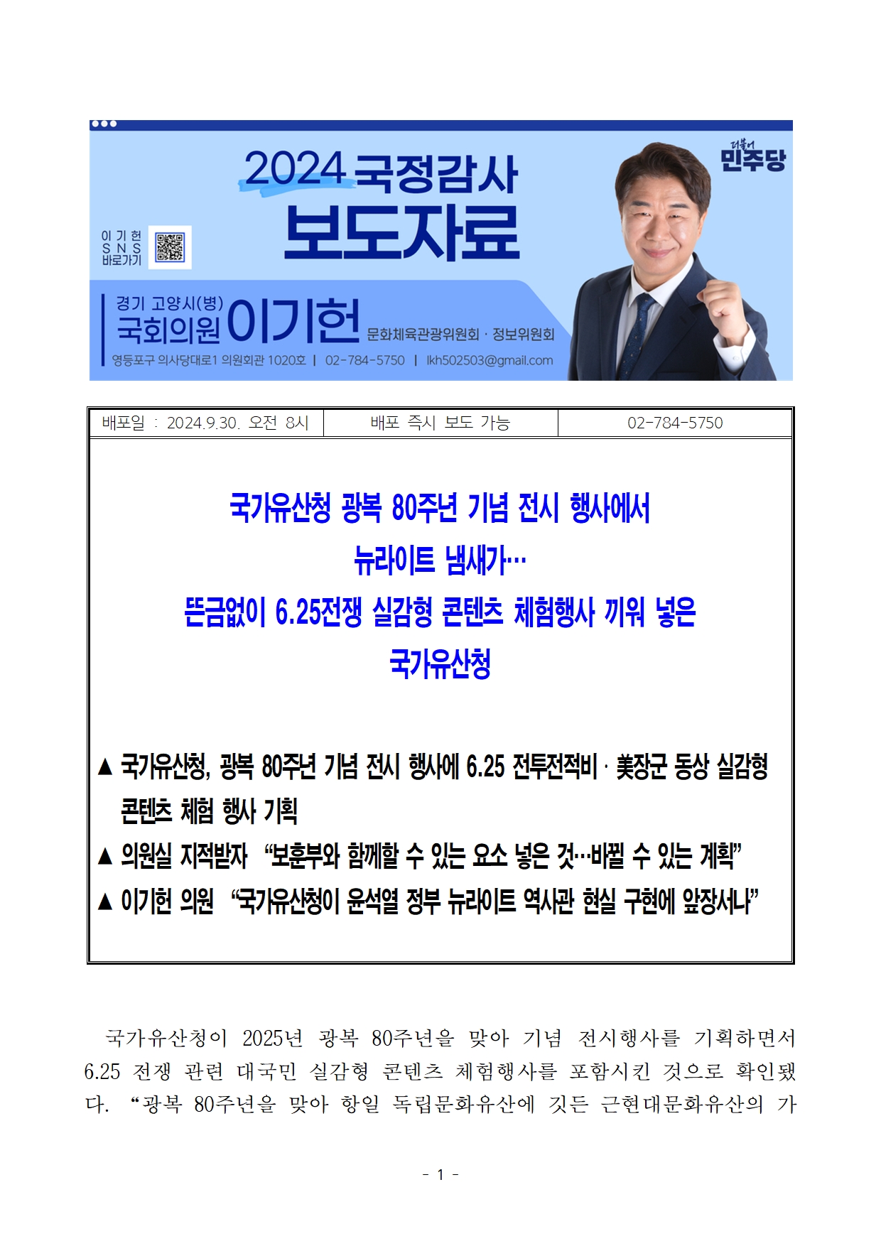 [이기헌 의원(고양시 병) 보도자료]광복 80주년 기념 전시 행사에서 뉴라이트 냄새가…뜬금없이 6.25전쟁 실감형 콘텐츠 체험행사 끼워 넣은국가유산청
