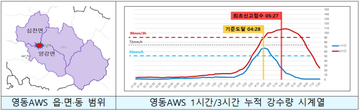 한편, 같은 날 충북 영동군에서도 폭우로 저수지가 범람해 70대 남성이 급류에 휩쓸려 실종되는 사건이 발생했다. 당시 ‘영동AWS(방재자동기상관측장비) 누적 강수량’을 보면 영동군에서 내린 비가 기상청 재난 문자(CBS) 발송 기준에 도달한 시간은 오전 4시 28분이다. 최초 사고가 접수된 오전 5시 27분보다 1시간가량 앞선 시점이다.
