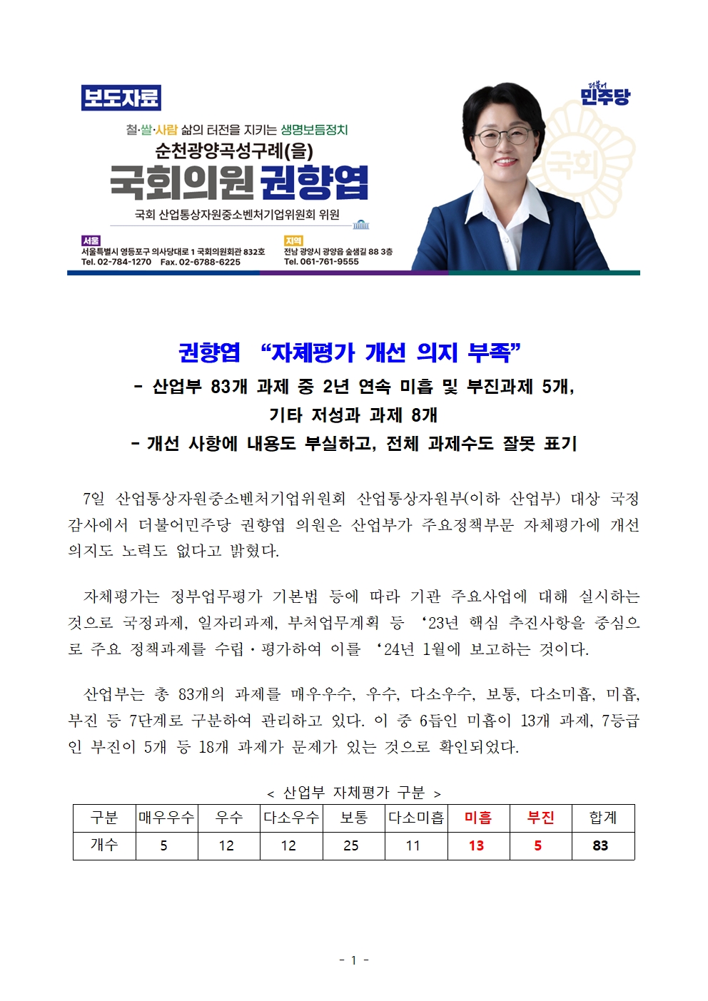 [권향엽 국회의원] 241008 보도자료_산업부 자체평가 개선 의지 부족.hwp