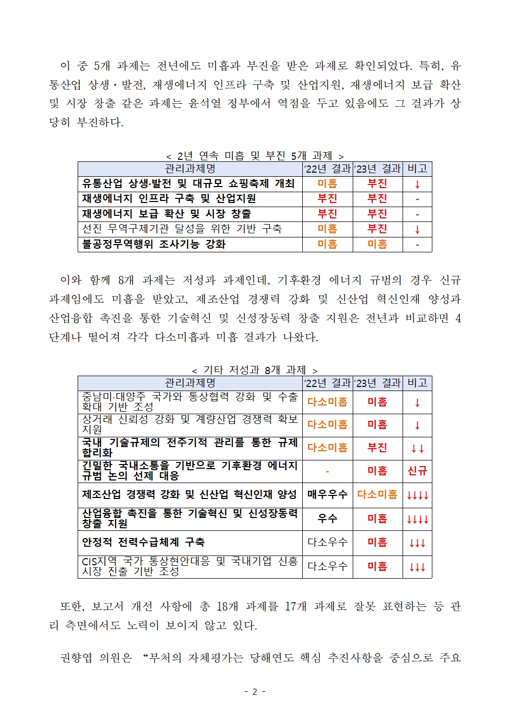 [국회의원 권향엽] 산업부, 자체평가 개선 의지 부족