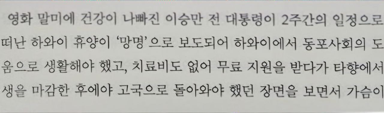 5월호에 실린 영화평에서는 이 전 대통령의 하와이 망명 관련 사실관계를 왜곡하고 있다. 저자는 “이승만 전 대통령이 2주간 일정으로 떠난 하와이 휴양이 ‘망명’으로 보도”되어서 “생을 마감한 후에야 고국으로 돌아와야 했던 장면을 보면서 가슴이 먹먹했다”라고 썼다. 이 대통령은 하와이 입국 후 허정 권한대행과 박정희 대통령에게 귀국 의사를 타전했으나 민심 이반이 우려되어 거부당했다.
