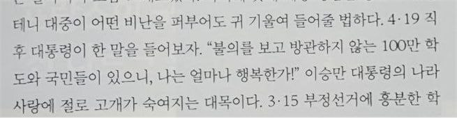 예컨대 4월호에 실린 영화평엔 “4·19 직후 대통령이 한 말을 들어보자. “불의를 보고 방관하지 않는 100만 학도와 국민들이 있으니, 나는 얼마나 행복한가!” 이승만 대통령의 나라사랑에 절로 고개가 숙여지는 대목이다”라고 썼다. 자신이 주도한 3·15 부정선거로 촉발된 4·19 혁명에 행복했다는 것도 언뜻 이해하기 어렵지만 이것이 나라사랑이라는 감상도 상식적이라고 보기 어렵다.