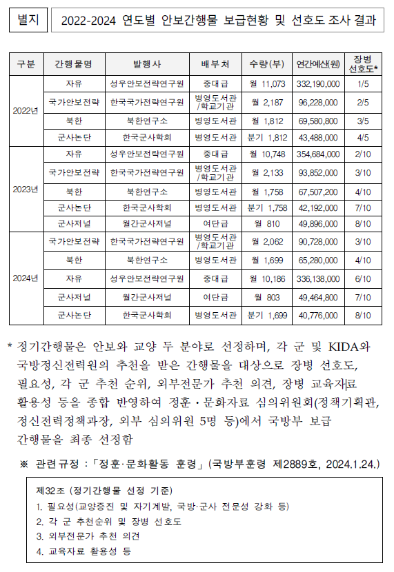 한편, 국방부 정신전력과는 각군 및 KIDA, 국방정신전력원의 추천을 받은 간행물을 대상으로 장병 선호도, 필요성, 각국 추천 순위, 외부전문가 의견, 활용성 등을 반영해 정훈·문화자료심의위원회에서 안보간행물을 최종 선정한다고 밝혔다.