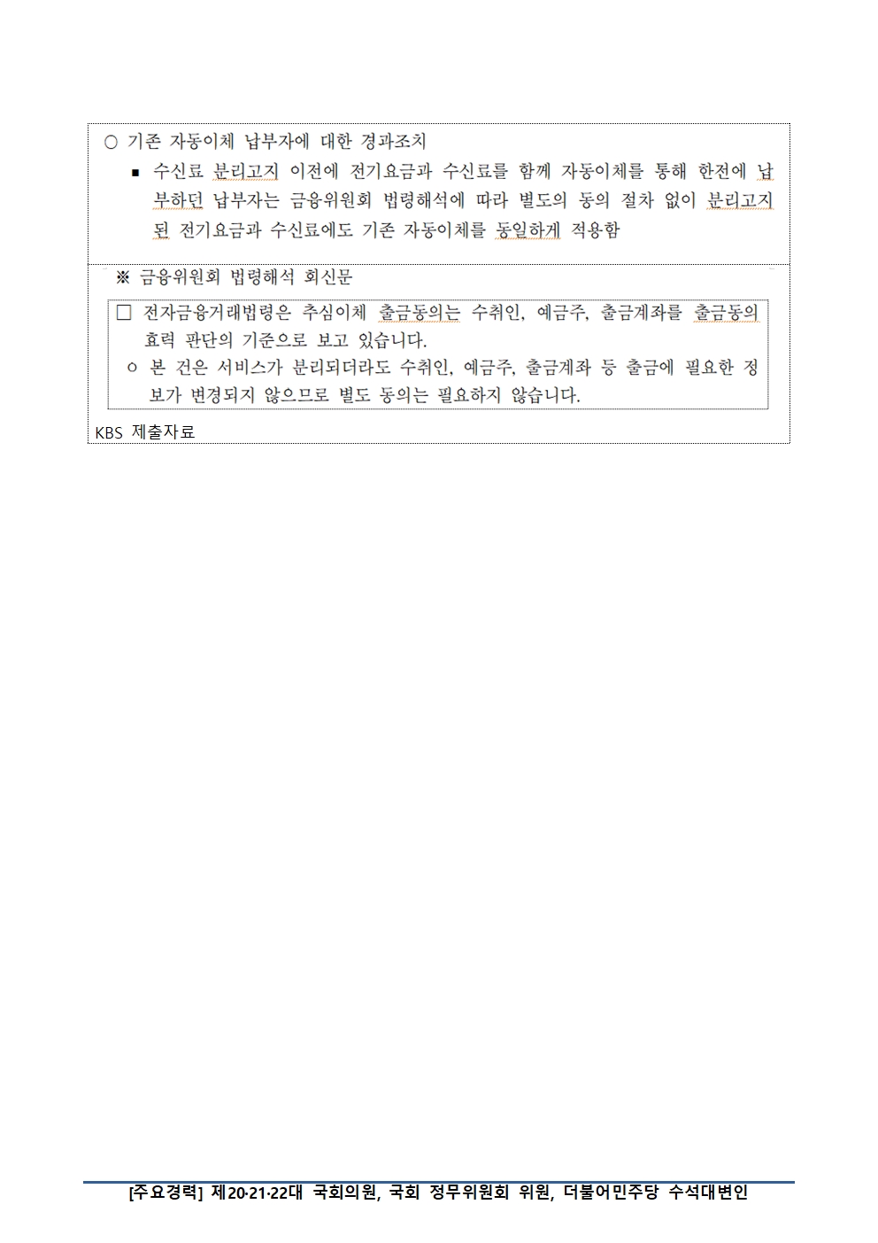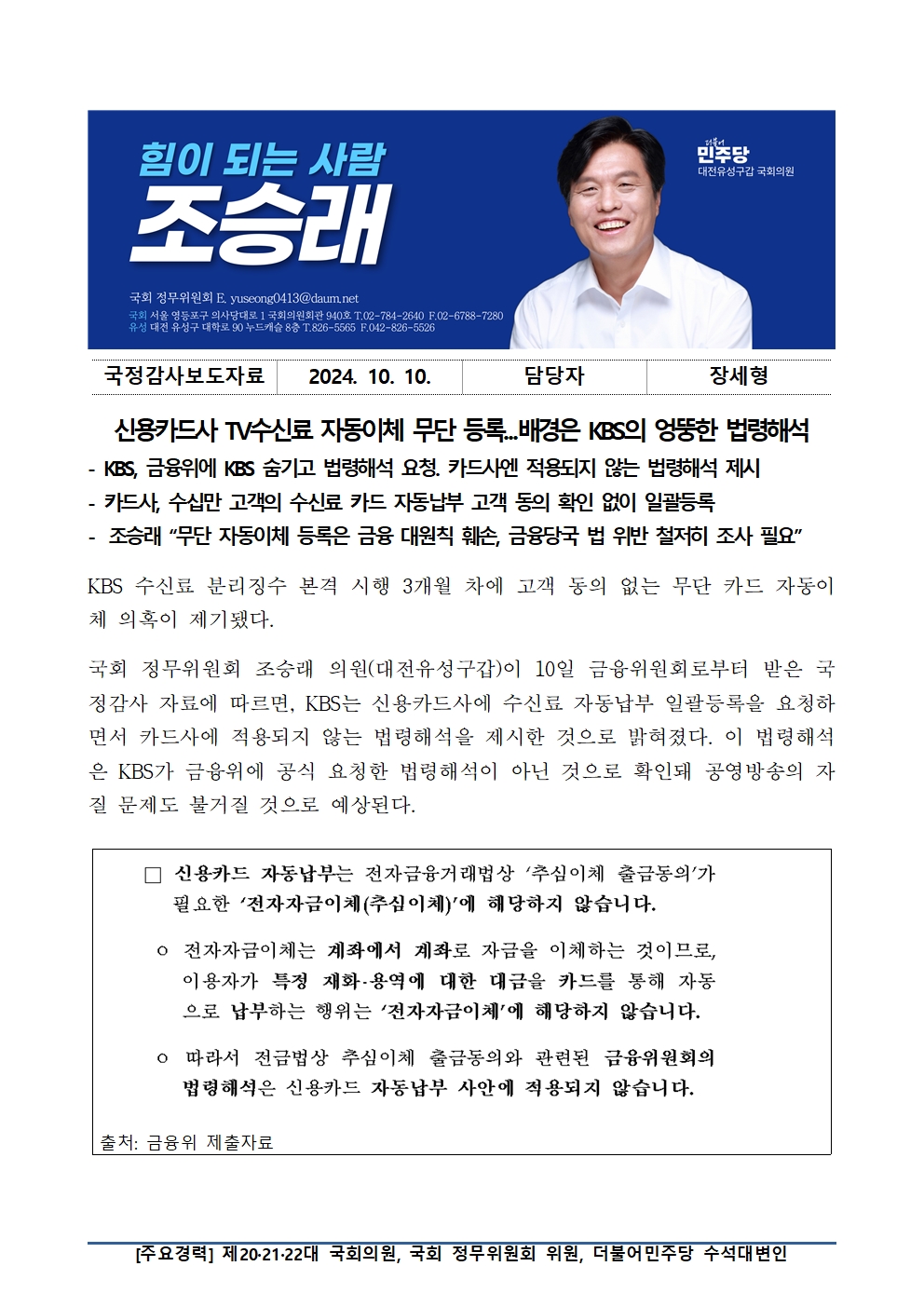 [국회의원 조승래] 신용카드사 TV수신료 자동이체 무단 등록...배경은 KBS의 엉뚱한 법령해석