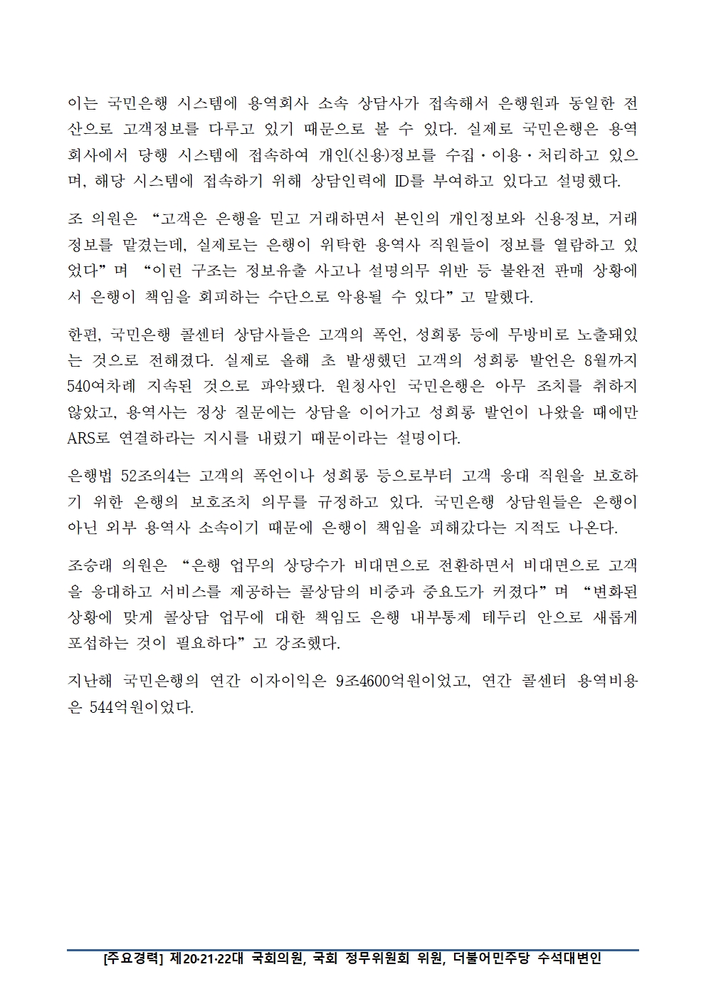 [국회의원 조승래] 조승래 의원, 국민은행 콜 상담사 직고용으로 실효성 있는 내부통제 강화 필요