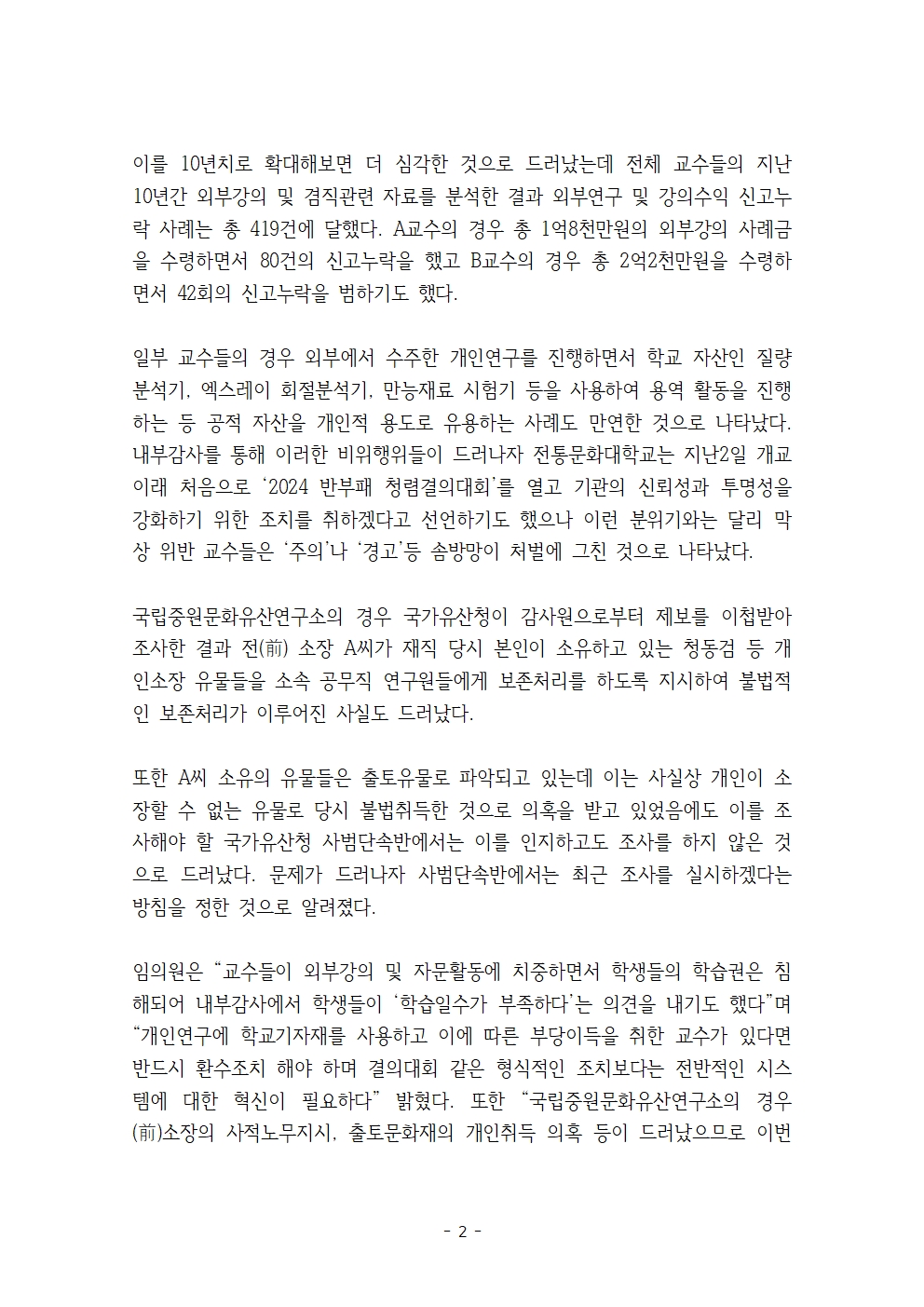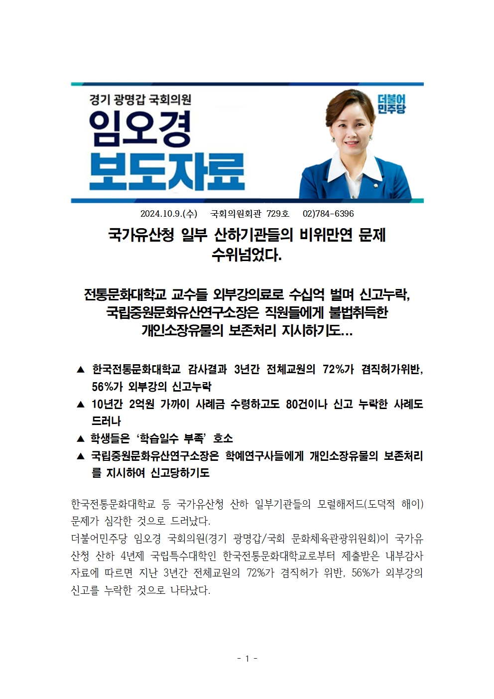 24.10.09_임오경 의원실 보도자료_국가유산청 일부 산하기관들의 비위만연 문제 수위넘었다..hwp