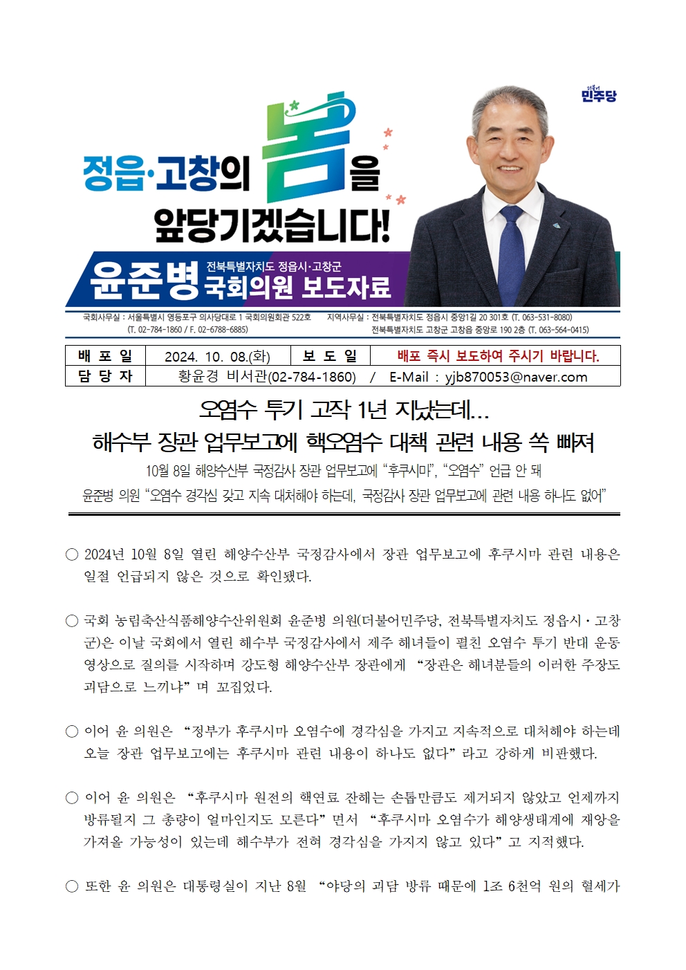 [윤준병 의원 국정감사 보도자료] 오염수 투기 고작 1년 지났는데 해수부 장관 업무보고에 대책 관련 내용 쏙 빠져