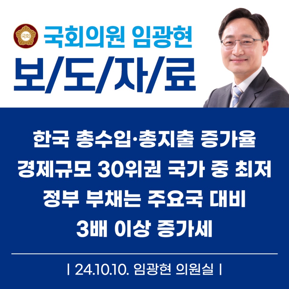 [임광현의원 국감 보도] 한국 총수입·총지출 증가율 경제규모 30위권 국가 중 최저정부 부채는 주요국 대비 3배 이상 증가세