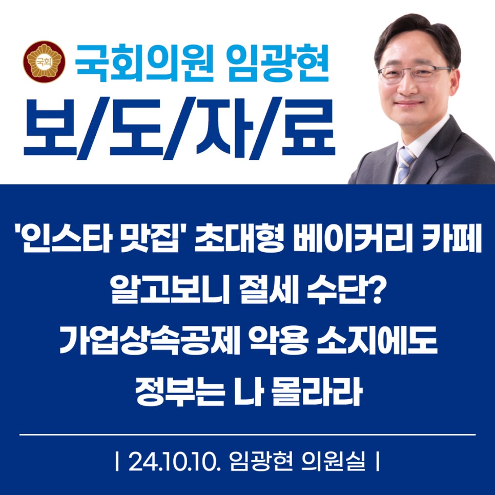 더불어민주당 기획재정위원회 소속 임광현 의원이(비례) 일부 초대형 베이커리카페의 가업승계지원제도 악용 소지를 지적했다. 이에 대한 정부의 실태파악과 제도개선을 촉구할 예정이다.