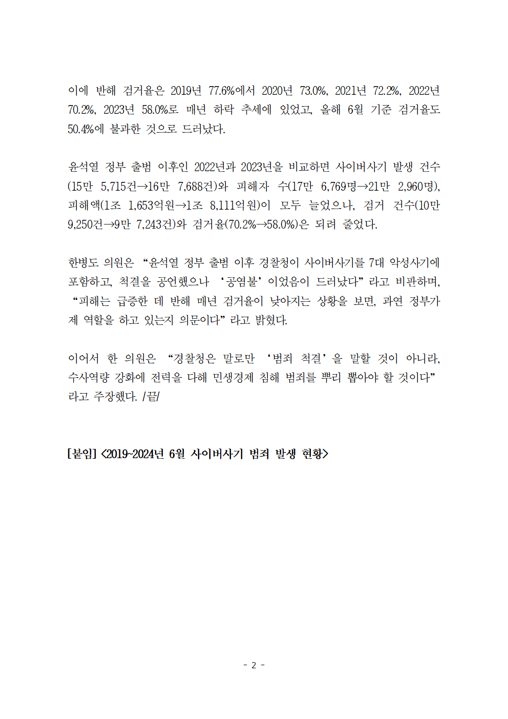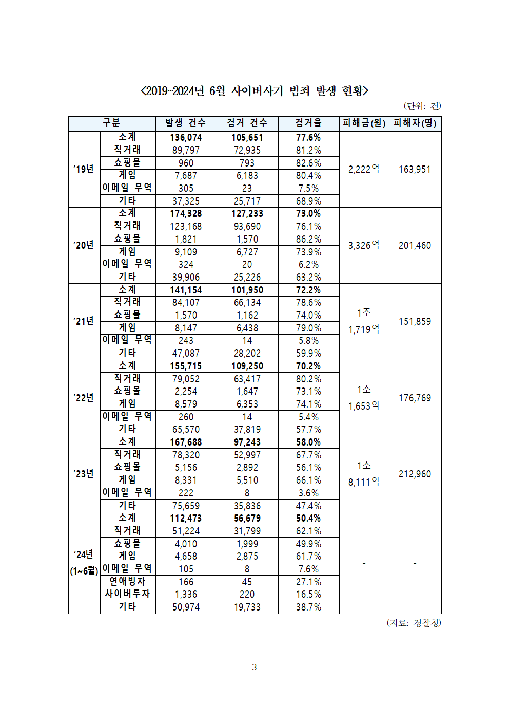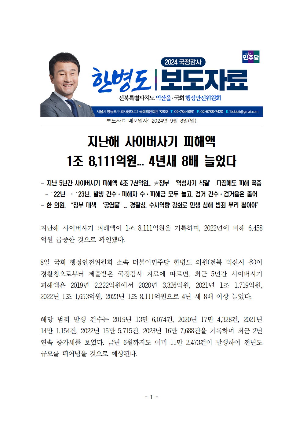 [한병도의원]2024행안위국정감사보도자료(6)지난해 사이버사기 피해액 1조 8111억원... 4년새 8배 늘었다.hwp