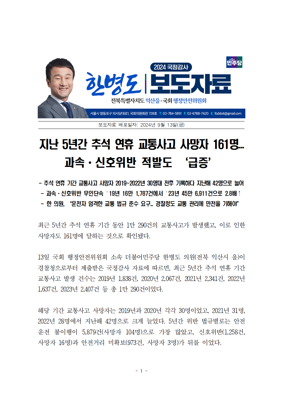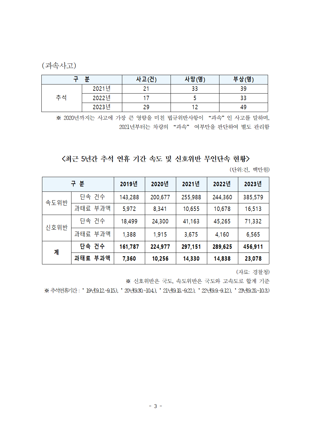 [한병도의원]2024행안위국정감사보도자료(11)5년간 추석 연휴 교통사고 사망자 161명... 과속ㆍ신호위반 적발도 ‘급증’.hwp