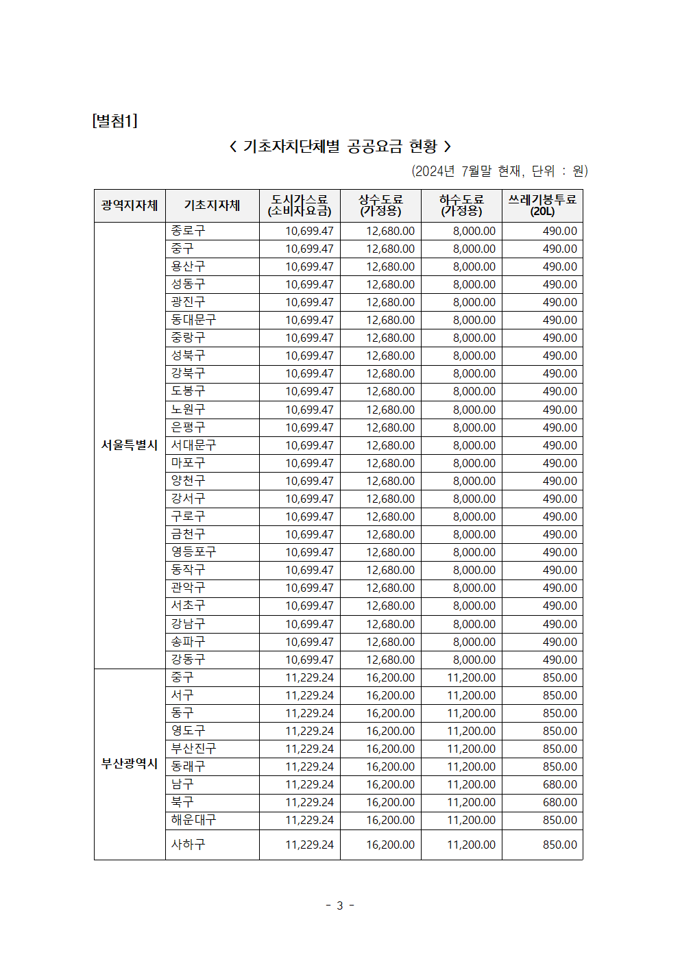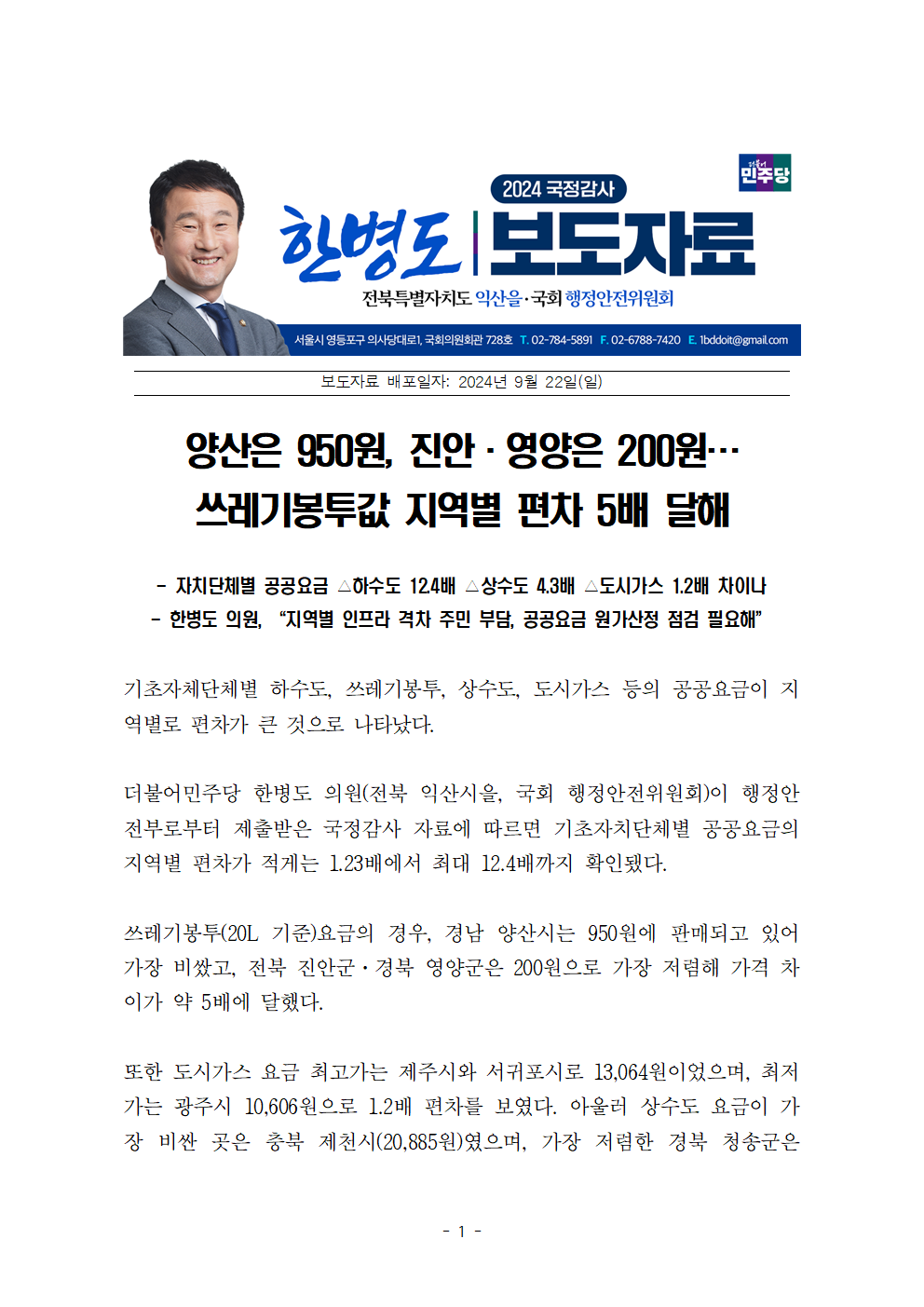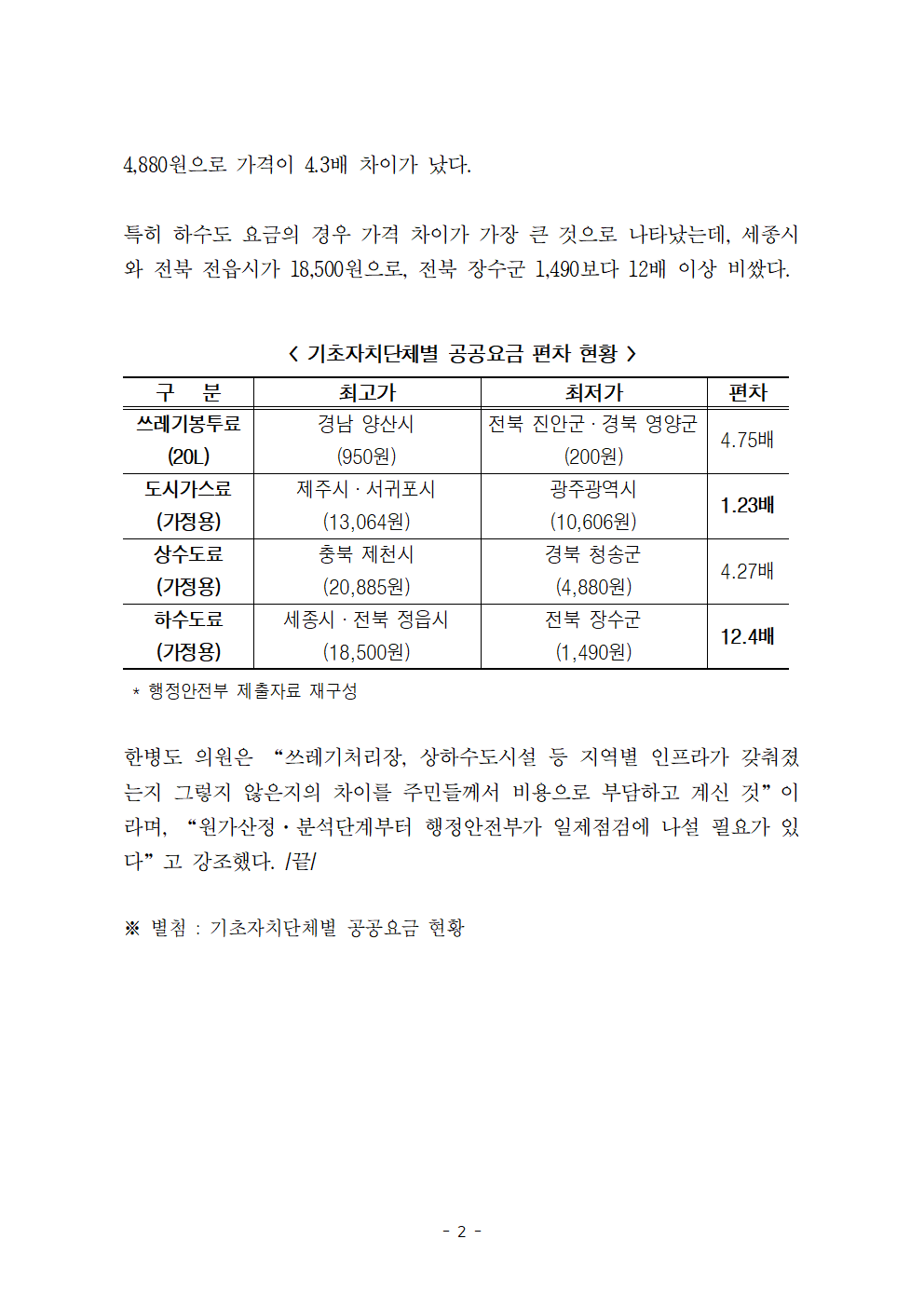 한병도의원_2024행안위국정감사보도자료(17)_전국 쓰레기봉투값 천차만별 지역별 공공요금 최대 10배 이상 차이.hwp