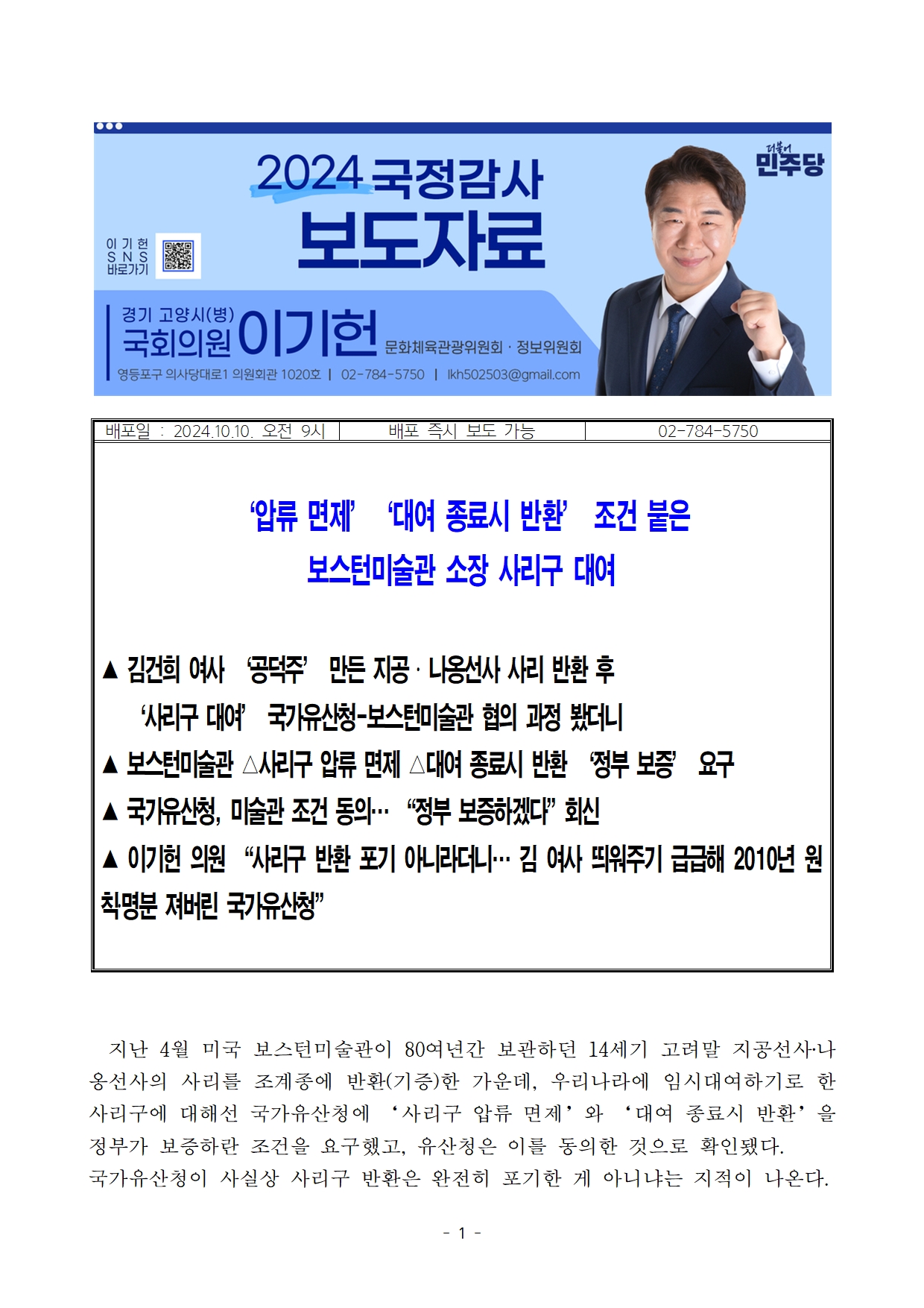 [이기헌 의원(고양시 병) 보도자료]'압류 면제' '대여 종료시 반환' 조건 붙은 보스턴미술관 소장 사리구 대여