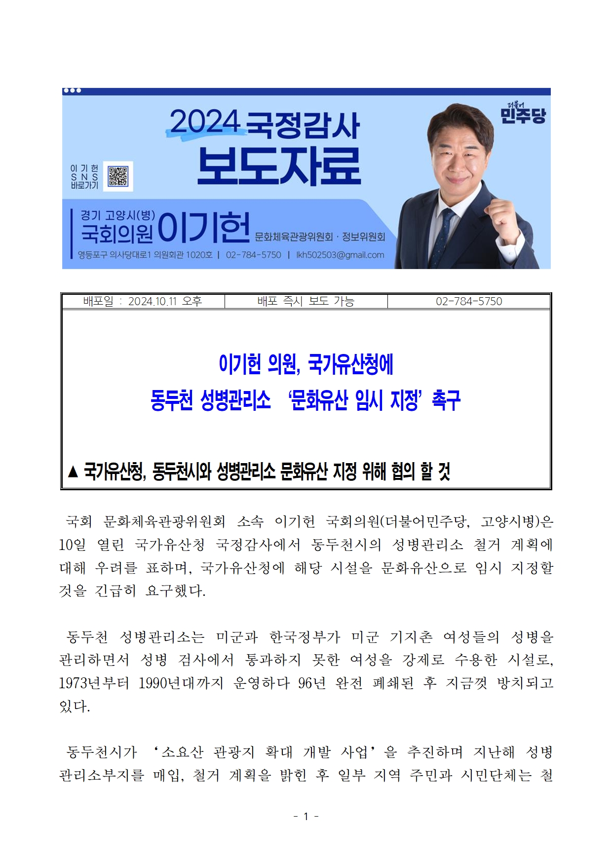 최종이기헌의원_국감보도자료_이기헌_의원_국가유산청에_동두천_성병관리소_‘문화유산_임시_지정’촉구.hwp