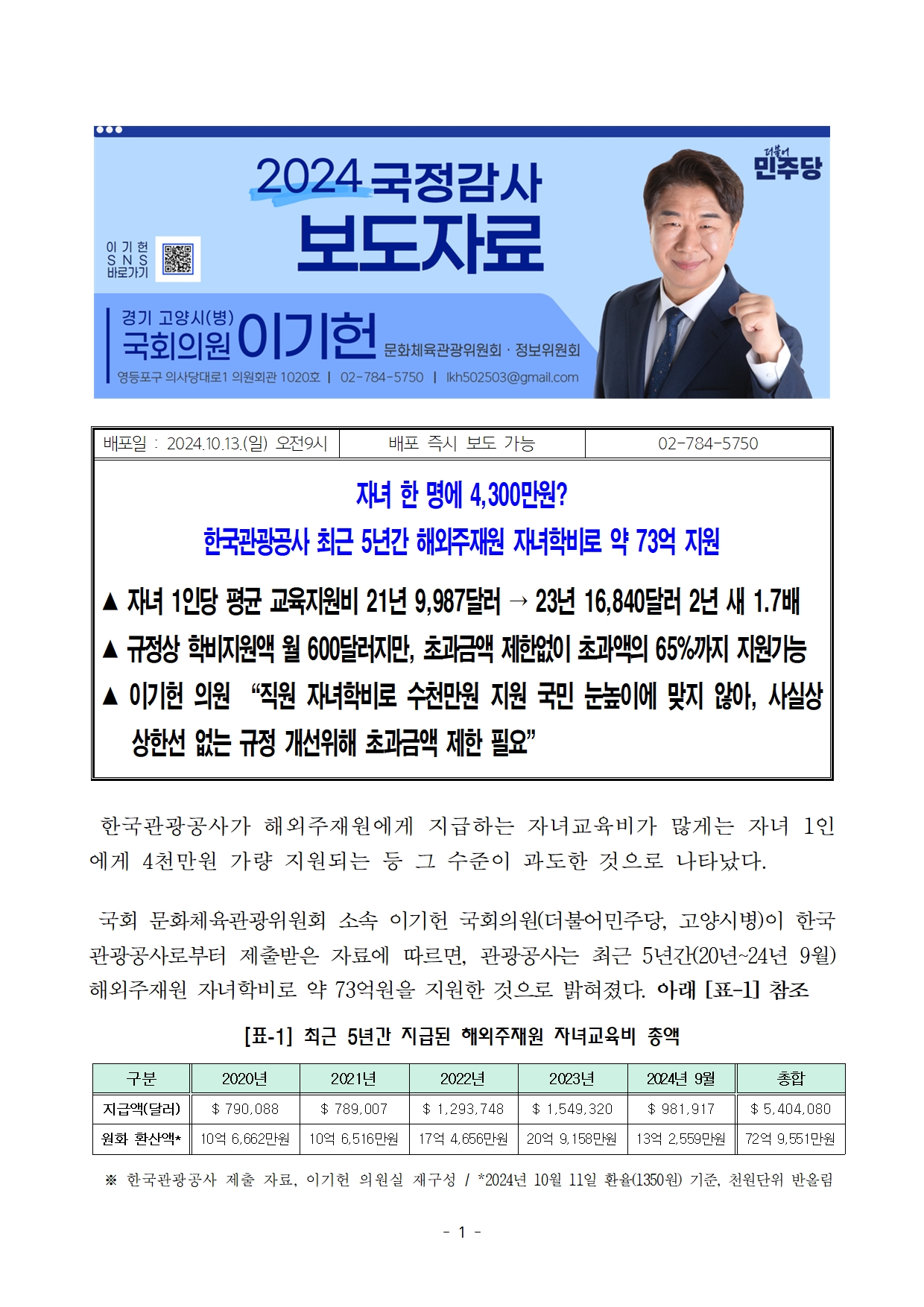 [이기헌 의원(고양시 병) 보도자료]자녀 한명에 4,300만원 한국관광공사 자녀교육비 과다