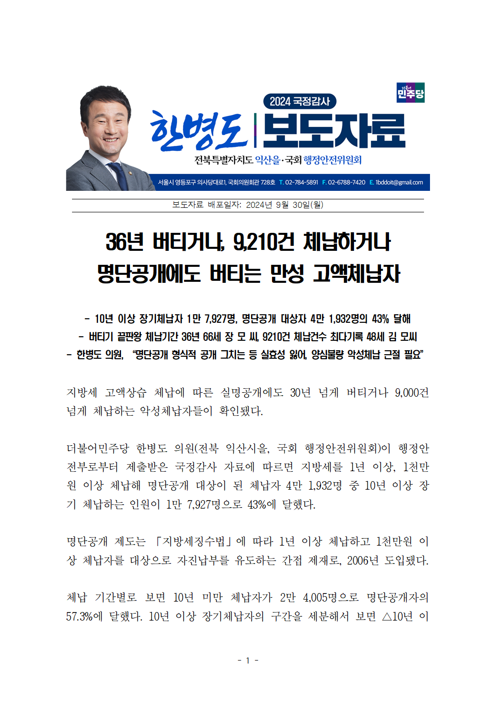 [한병도의원]2024행안위국정감사보도자료(23)_36년 버티거나 9210건 체납하거나... 명단공개에도 버티는 만성 고액체납자.hwp
