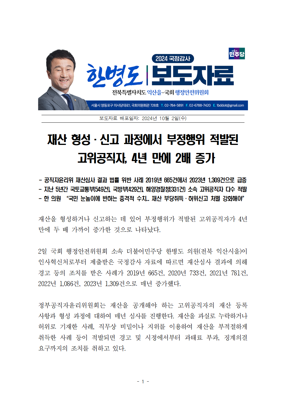 [한병도의원]2024행안위국정감사보도자료(25)재산 형성·신고 과정에서 부정행위 적발된 고위공직자 4년 만에 2배 증가.hwp